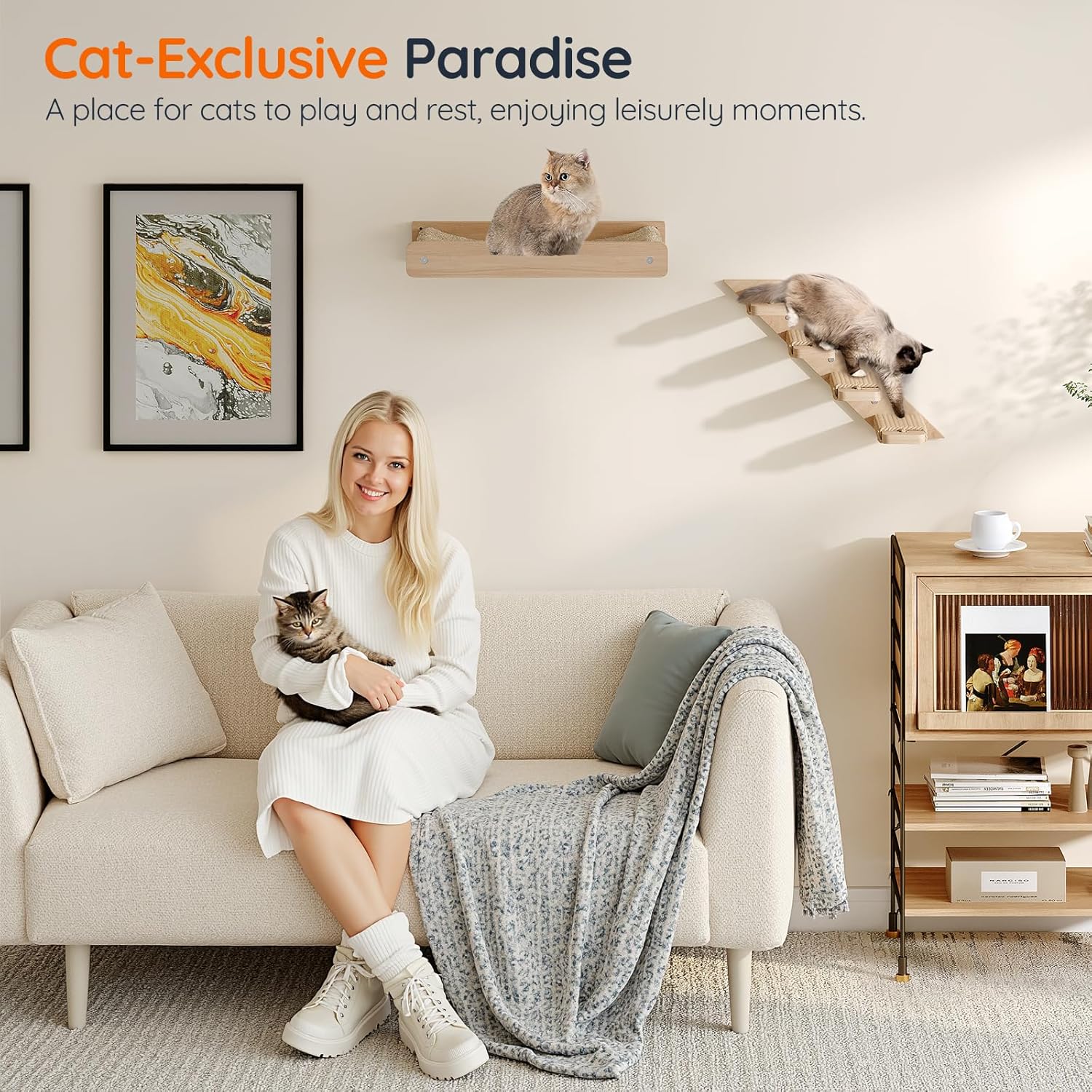 - Non-Slip Cat Ladder: With polished steps and rounded edges, complemented by wrapped jute rope, this ladder offers a secure and cozy climbing experience that releases cats' innate desire to climb and scratch, allowing them to express their natural behaviors