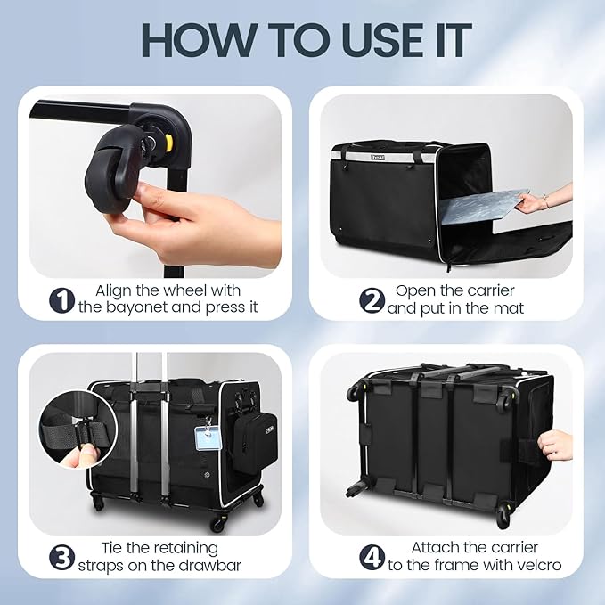 - 【360° ROTATION WHEELS】Velcro on the bottom of the large pet carrier wheels and a strap on the handle make it easy to attach the bag to the wheels. And four 360° rotation wheels can ensure a smooth and comfortable riding experience for the rolling cat carrier on uneven road surfaces or grass.