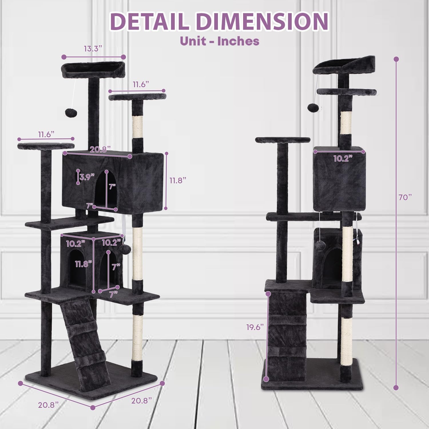 - Multi-Functional Cat Tower:This 70-inch cat tree has a small footprint and provides a diverse activity area for cats This cat tree is equipped with hanging toys that stimulate play and prey instincts and satisfy your cat's instincts and desire for adventure.