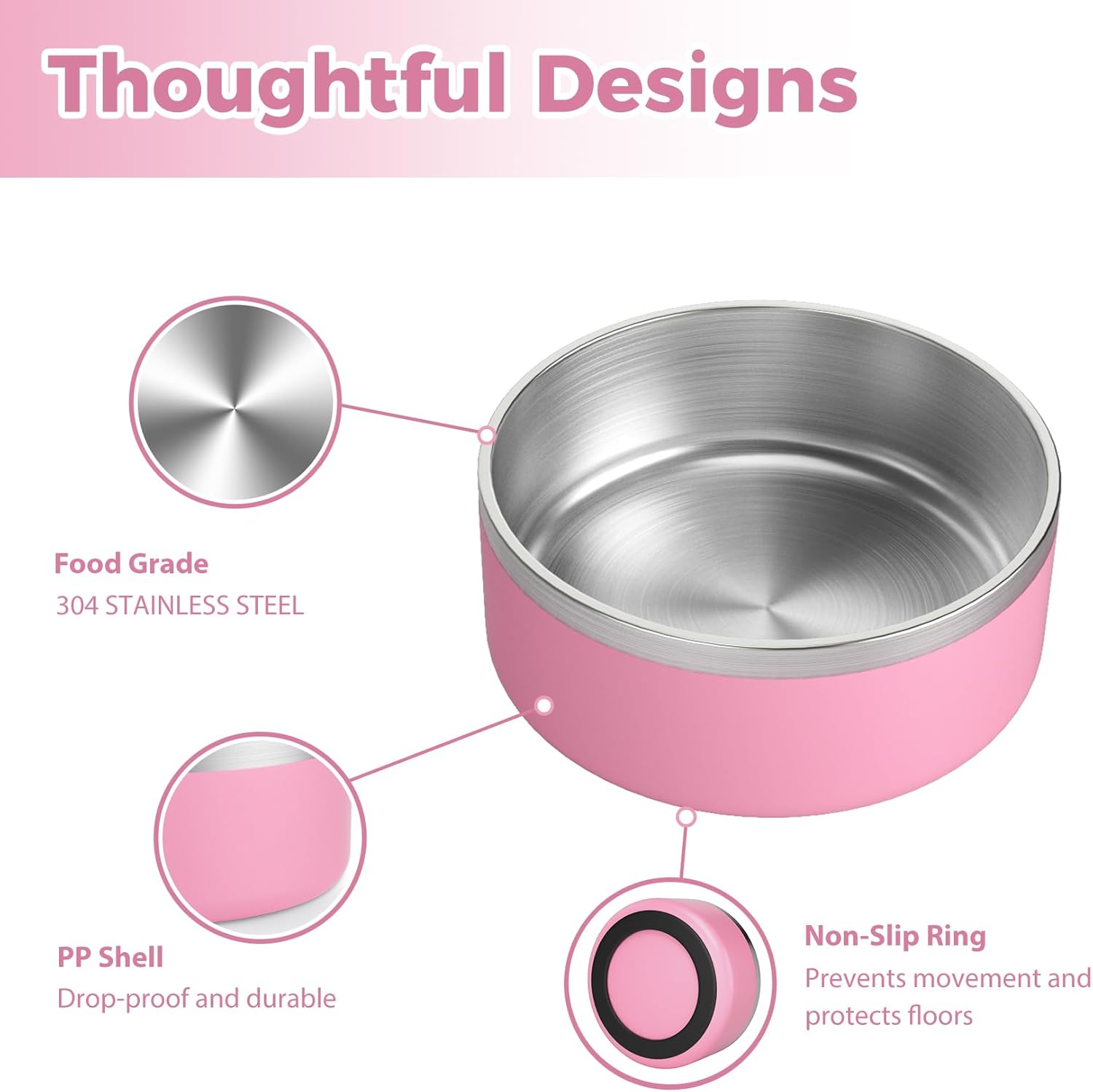 Stainless Steel Dog Bowl, Metal Water and Food Dish for Large Dogs, Insulated Non-Slip Pet Bowl, Easy Clean, 64oz, Pink