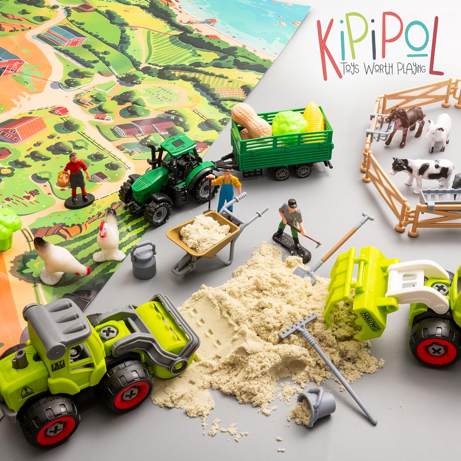 - ALL- IN -ONE FARM SAND KIT: Unleash a world of sensory play with the KipiPol 59-piece farm sand box set! Packed with 2.2 lbs of moon sand, 3 detachable tractors, 3 farm workers, 15 farm animals, 9 veggies, 12 fences, 2 screwdrivers, 11 farm tools, an activity map, and a sandbox with a lid—everything your little farmer needs for endless toddler activities and sensory fun!