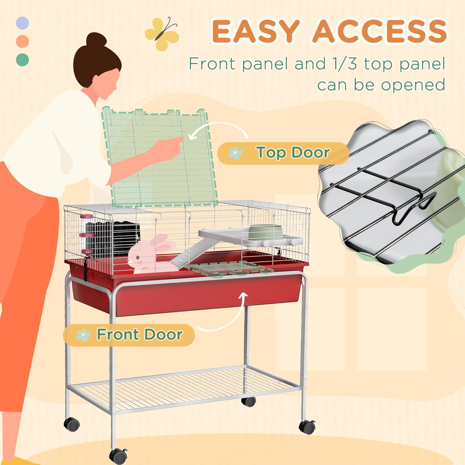 PawHut Two-Story Small Animal Cage Removable from Stand, Guinea Pig Cage with Shelf & Wheels, Pet Habitat for Hedgehog, Chinchilla, Ferret, 33" x 18.5" x 35", Red