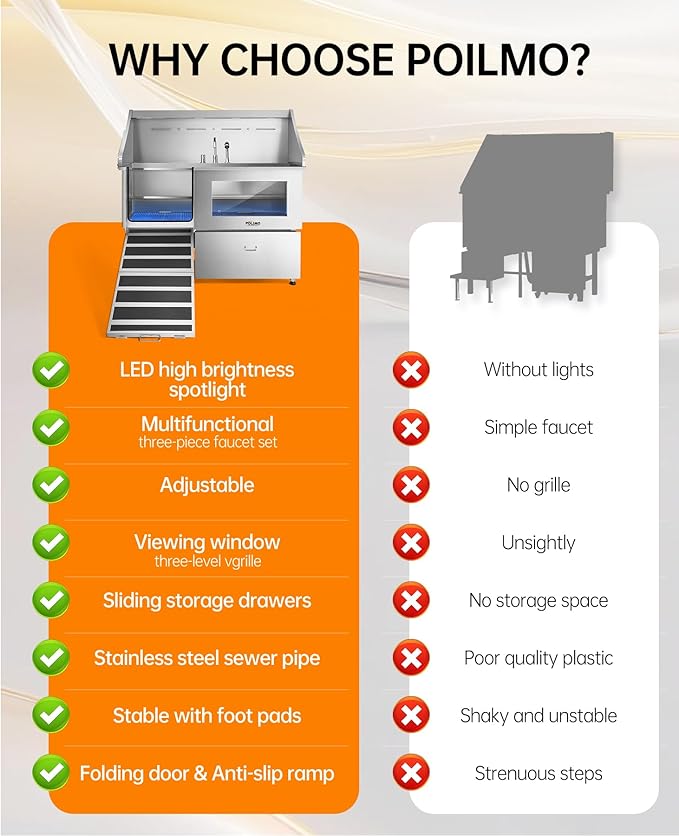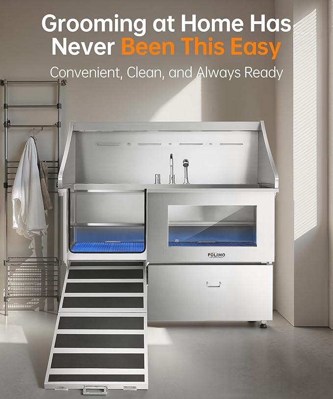- Innovative and Practical Design: The POLIMO dog grooming station features multiple outstanding design elements: β IP65 Waterproof high-brightness LED spotlight. β‘ Grade A tempered glass observation window. β’ The bathtubβs side panels feature a curved slide design, making it easier to operateβ£ Two-piece floor grid, adjustable to three different heights. β€ Sliding storage drawer for organized storage. β₯ Multi-function faucet and showerhead, adjustable to left, center, or right positions.β¦ Two drainage options are available: one with a pet hair catcher and another stainless steel drain pipe featuring an odor-blocking S-trap design