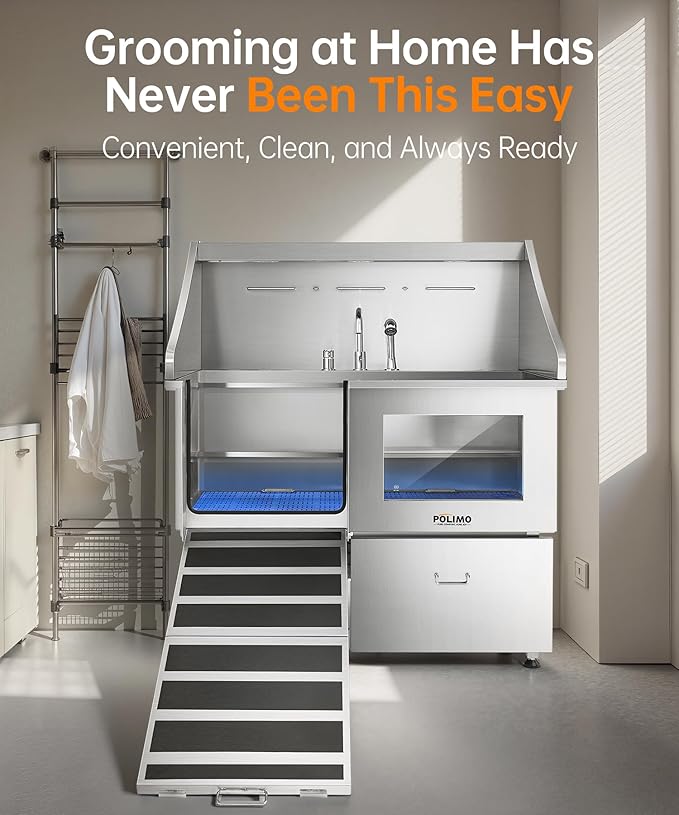 - Innovative and Practical Design: The POLIMO dog grooming station features multiple outstanding design elements: β IP65 Waterproof high-brightness LED spotlight. β‘ Grade A tempered glass observation window. β’ The bathtubβs side panels feature a curved slide design, making it easier to operateβ£ Two-piece floor grid, adjustable to three different heights. β€ Sliding storage drawer for organized storage. β₯ Multi-function faucet and showerhead, adjustable to left, center, or right positions.β¦ Two drainage options are available: one with a pet hair catcher and another stainless steel drain pipe featuring an odor-blocking S-trap design