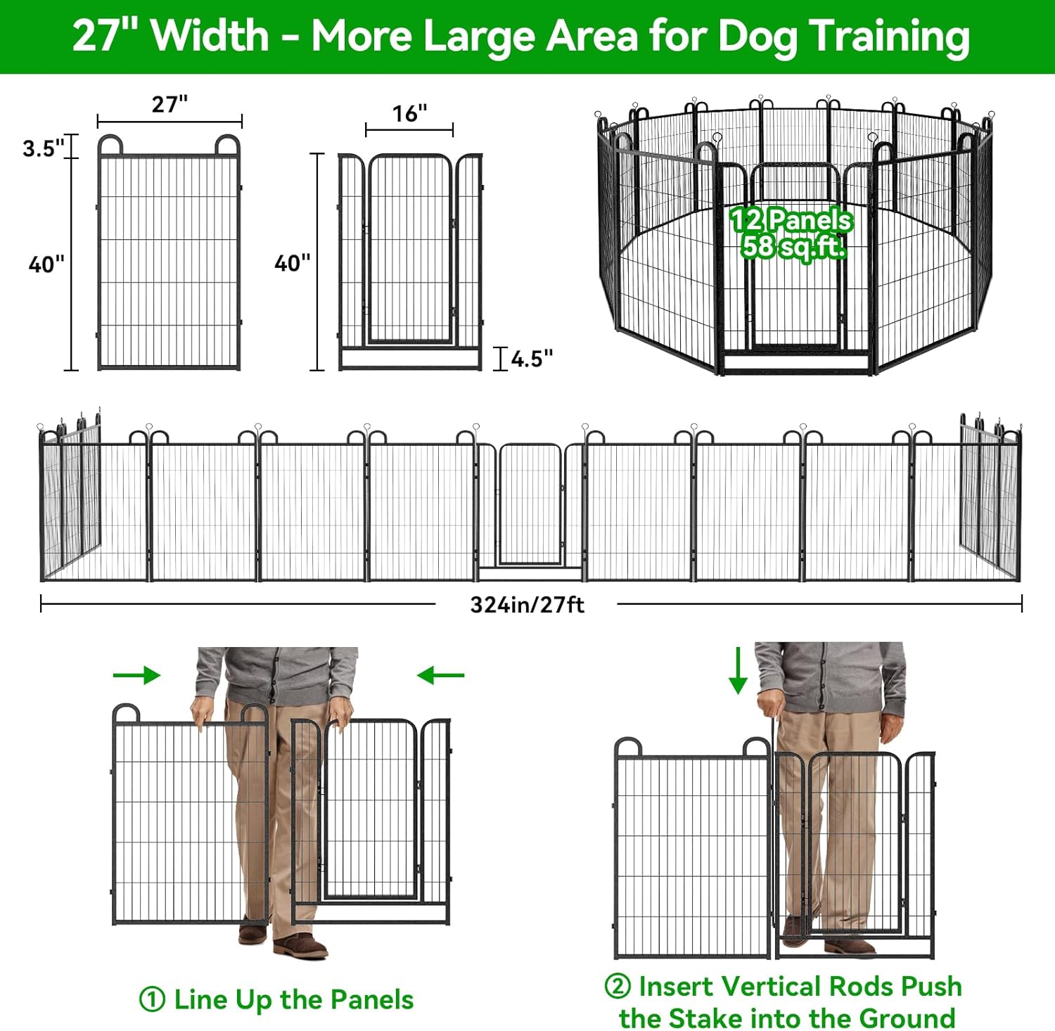 Dog Playpen Outdoor 12 Panels Heavy Duty Dog Fence 40" Height Anti-Rust with Doors Portable for RV Camping Yard, Total 27FT, 58 Sq.ft, Snowy Black