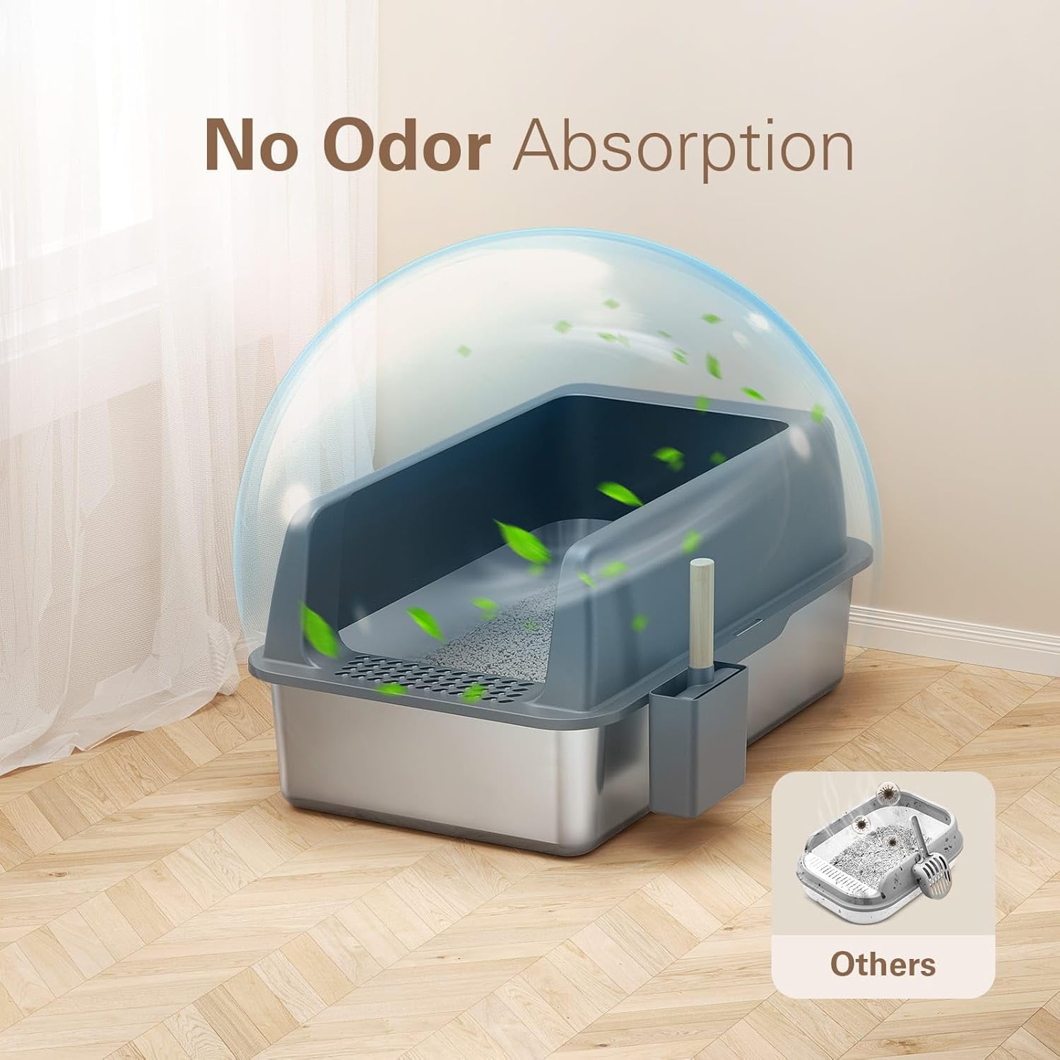 - γSturdy Stainless Steel Buildγ: Constructed from thick stainless steel for added durability, the stainless steel litter box is designed to withstand daily use, resisting rust and scratches from cat paws. The non-porous nature feature of stainless steel litter box also prevents odors from lingering, extending the lifespan and reducing the need for frequent replacement.