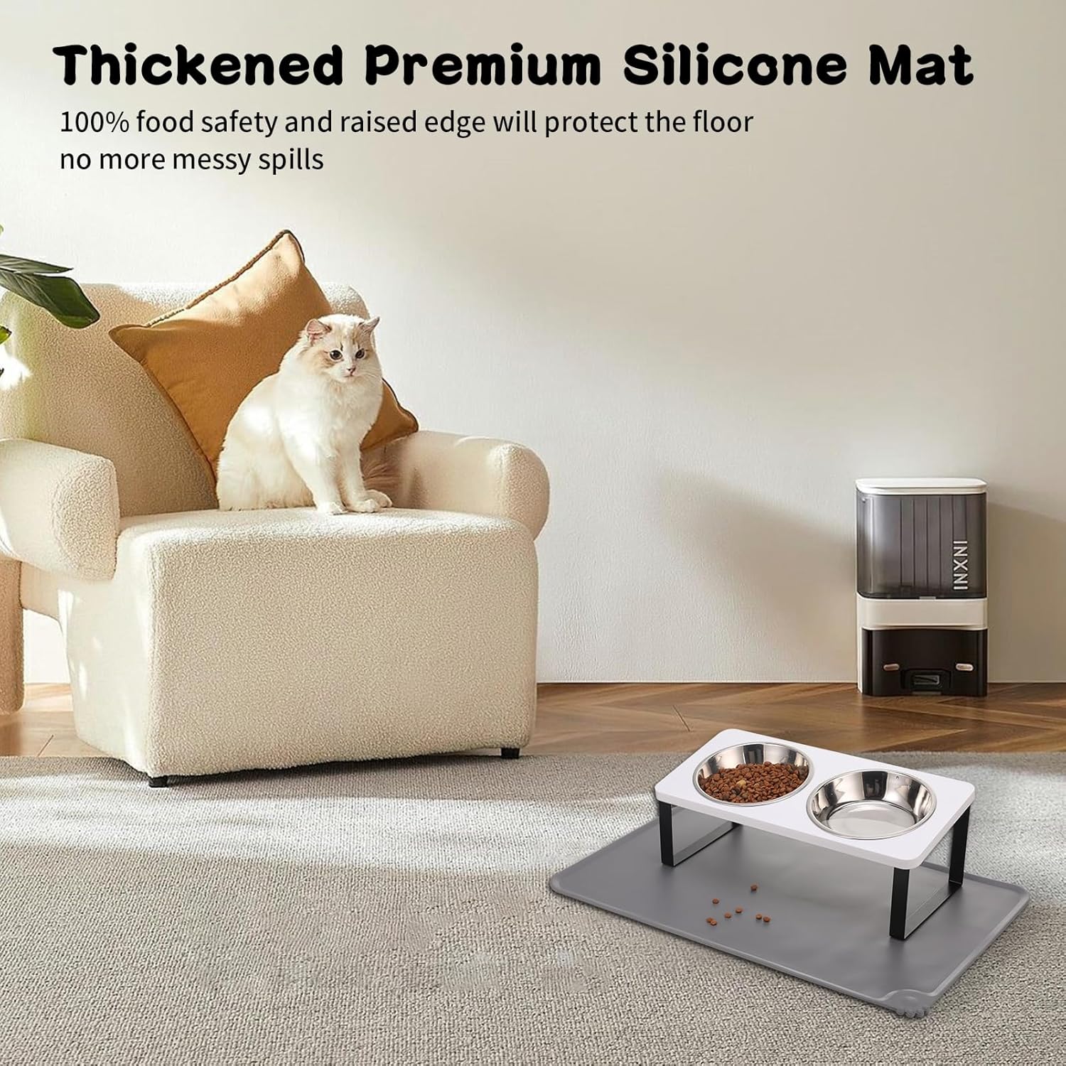 - 【Silicone Food Mat】Pet feeding bowl with silicone bowl mat can prevent cats and puppies from spilling food residue on the floor while feeding, keep the room or carpet clean and hygienic. Great Value Matching, Mat Size:18.9*11.8 inches.