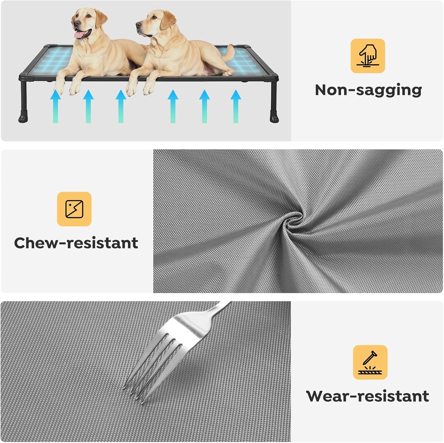 - Upgraded Composite Fabric: Different from the mesh fabric on the market, the dog cot uses Oxford cloth PVC composite fabric. No elasticity, no sagging; Double composite fabric, more tear-resistant; more chew-resistant.