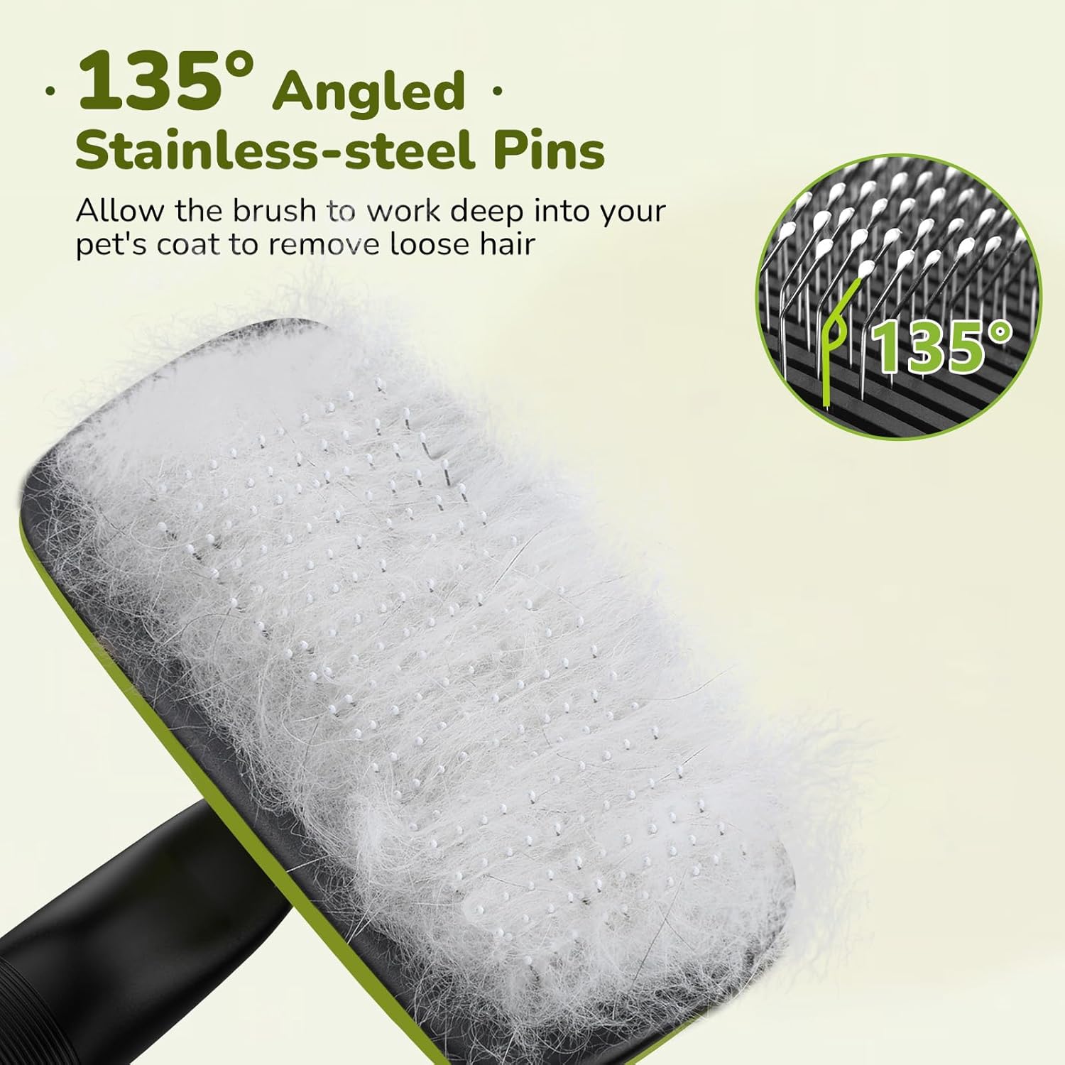 - EFFICIENT FUR REMOVAL, GENTLE ON YOUR PET'S SKIN : The pet hair brush is designed with fine 135Β° stainless steel bristles and gentle massage particles that effectively remove loose hair, dander, & dirt trapped beneath the fur without causing any discomfort or irritation to the pet's skin. Leave the pet's fur soft and shiny!