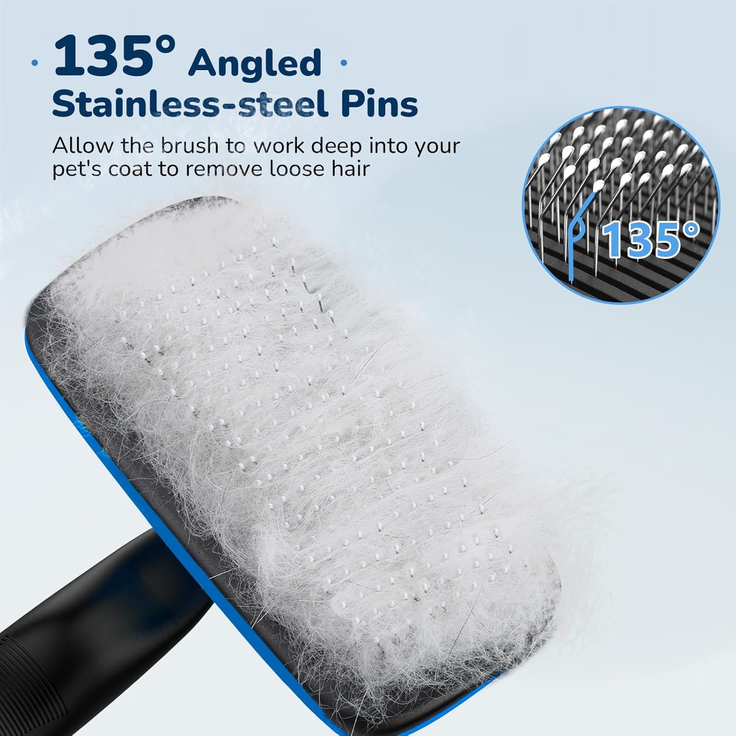 - EFFICIENT FUR REMOVAL, GENTLE ON YOUR PET'S SKIN : The pet hair brush is designed with fine 135Β° stainless steel bristles and gentle massage particles that effectively remove loose hair, dander, & dirt trapped beneath the fur without causing any discomfort or irritation to the pet's skin. Leave the pet's fur soft and shiny!