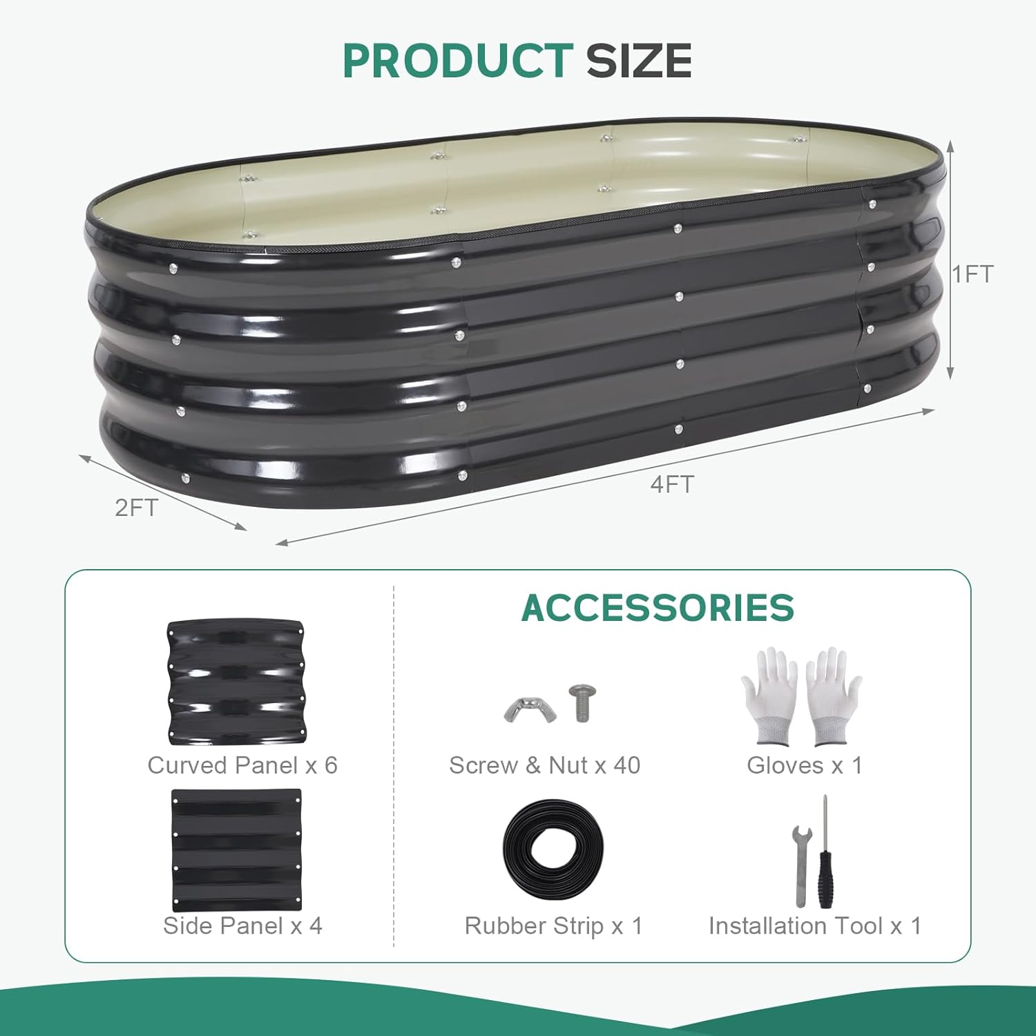 Galvanized Raised Garden Bed Outdoor - 4×2×1ft Planter Raised Beds for Gardening | Oval Metal Garden Planter Box with Safety Edging and Gloves for Vegetables Fruits and Flowers - Grey