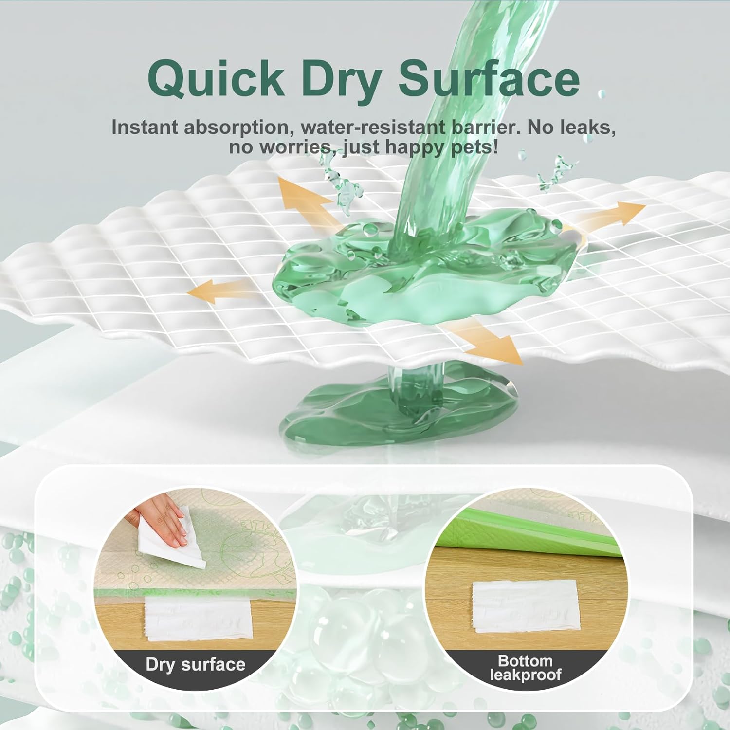 - γRapid AbsorptionγGrid design for diversion function, which help to expand the absorption area, ensuring faster urine penetration. With an impressive 1000ml capacity and ultra-fast absorption rate, our pee pads excel in maintaining dryness, keeping your pet comfortable and free from wetness on its belly, legs, or paws.