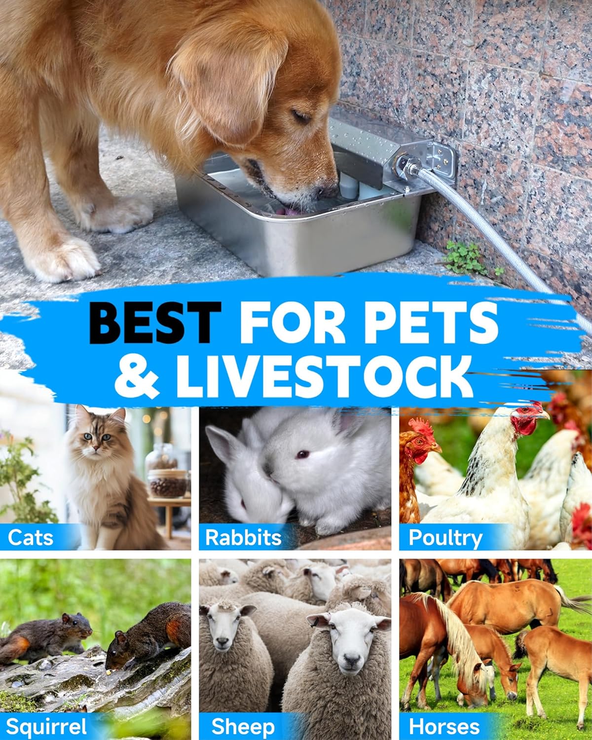 - ULTRA-LARGE CAPACITY: This water dispenser holds up to 2 gallons, ideal for multi-pet families. Its wide-mouth design is also suitable for livestock (such as chickens, ducks, geese, rabbits, sheep, horses, and cows) and wildlife (like squirrels and raccoons)