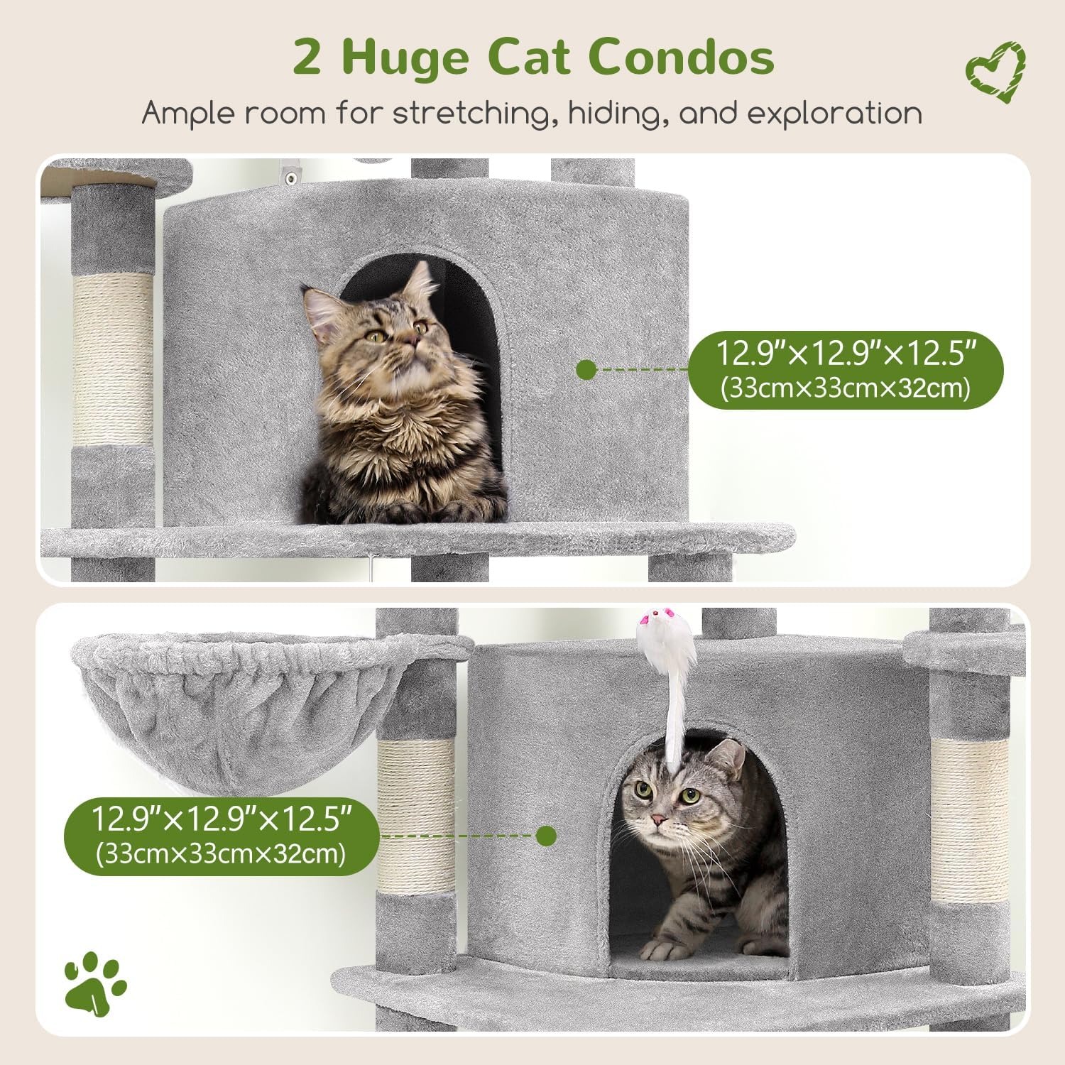 Globlazer Corner Cat Tree for Large Cats, 66inch Tall Curved Series Large Cat Tower for Multiple Indoor Cats with 6 Scratching Posts, 2 Spacious Cat Condos, Hammock, Hanging Basket, C66, Light Grey