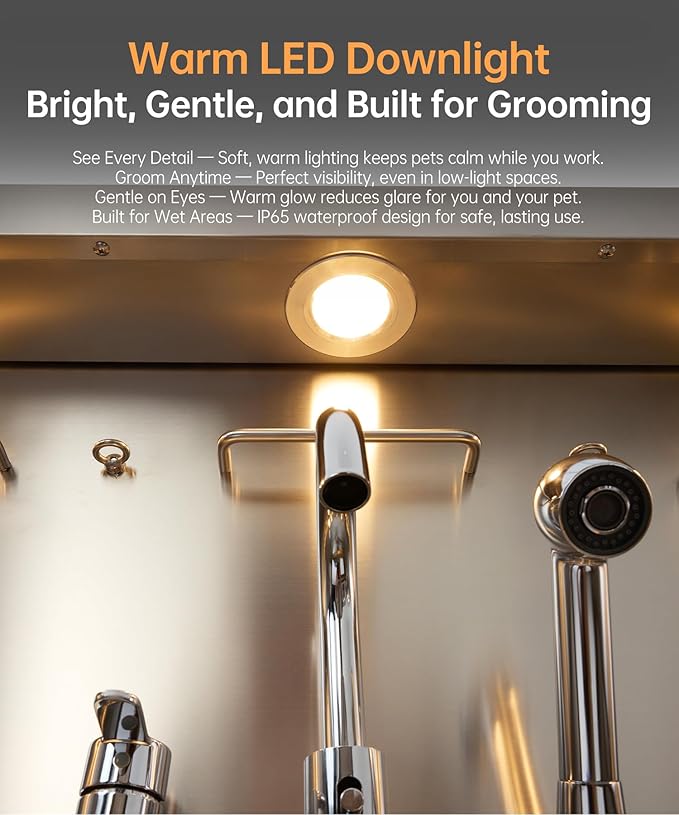 - Innovative and Practical Design: The POLIMO dog grooming station features multiple outstanding design elements: β IP65 Waterproof high-brightness LED spotlight. β‘ Grade A tempered glass observation window. β’ The bathtubβs side panels feature a curved slide design, making it easier to operateβ£ Two-piece floor grid, adjustable to three different heights. β€ Sliding storage drawer for organized storage. β₯ Multi-function faucet and showerhead, adjustable to left, center, or right positions.β¦ Two drainage options are available: one with a pet hair catcher and another stainless steel drain pipe featuring an odor-blocking S-trap design