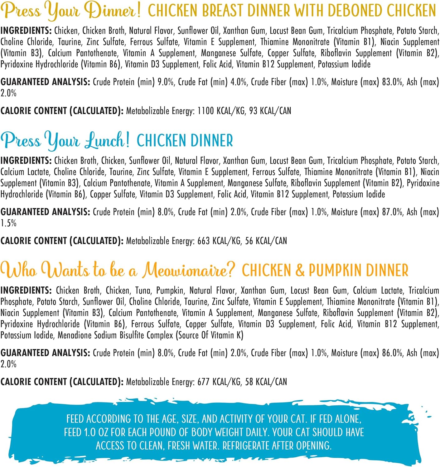 - Weruva Wet Cat Food, The Chicken Lounge Paté Variety Pack 3oz, Pack of 12 includes four (4) of each: Press Your Lunch, Press Your Dinner, Who Wants to be a Meowionaire.