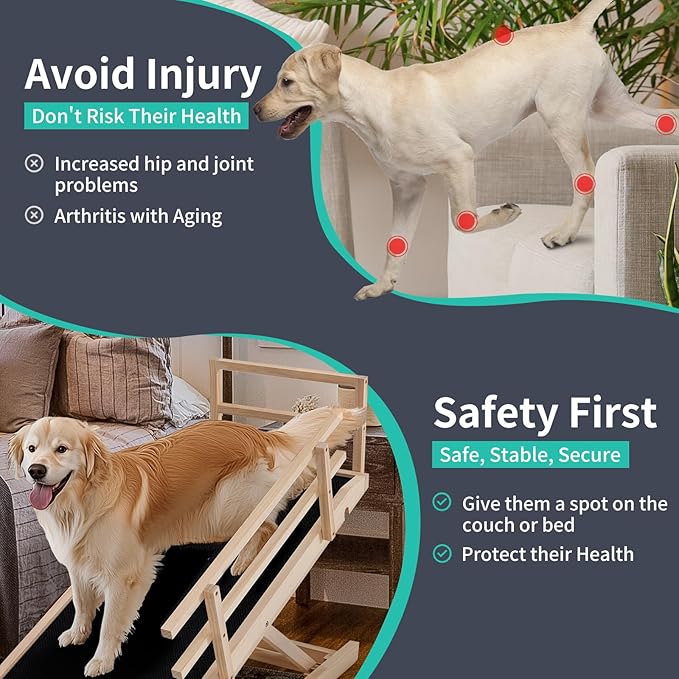 - STURDY & DURABLE: Our pet ramp for dogs and cats is specially made very well - solid wood construction and sturdy stainless steel fasteners, which has been tested to support up to 200lbs. When they jump off the bed, sofa, and sofa, there is no need to worry about getting injured, which provides safety for your pet.