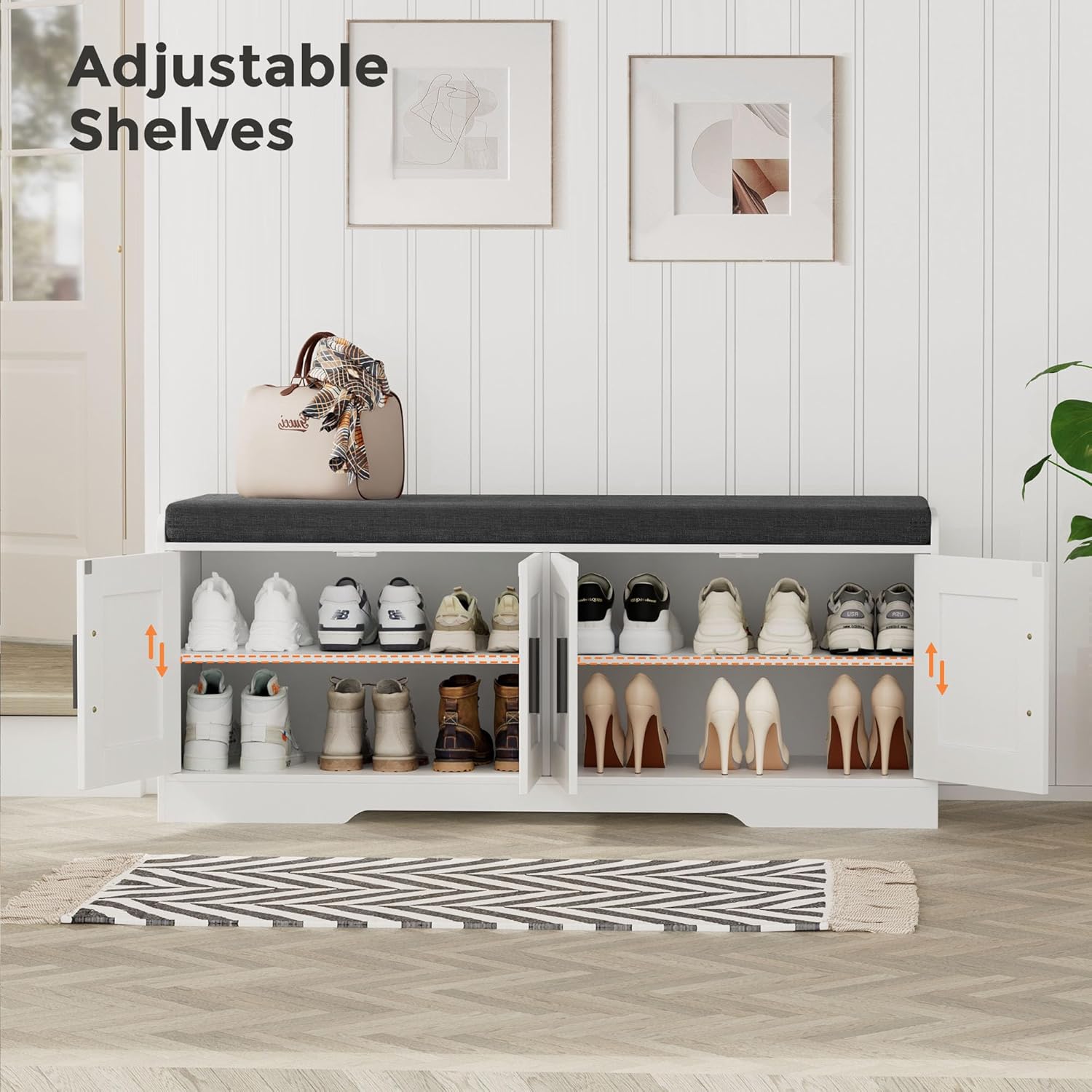 - Keep Your Shoes Organized: The depth of bench is 13.8 inches, which makes it easily to put in your shoes, meanwhile shoes of various heights can be placed by adjusting middle movable boards. The bench doors design ensures not only your privacy, but also a tidy space