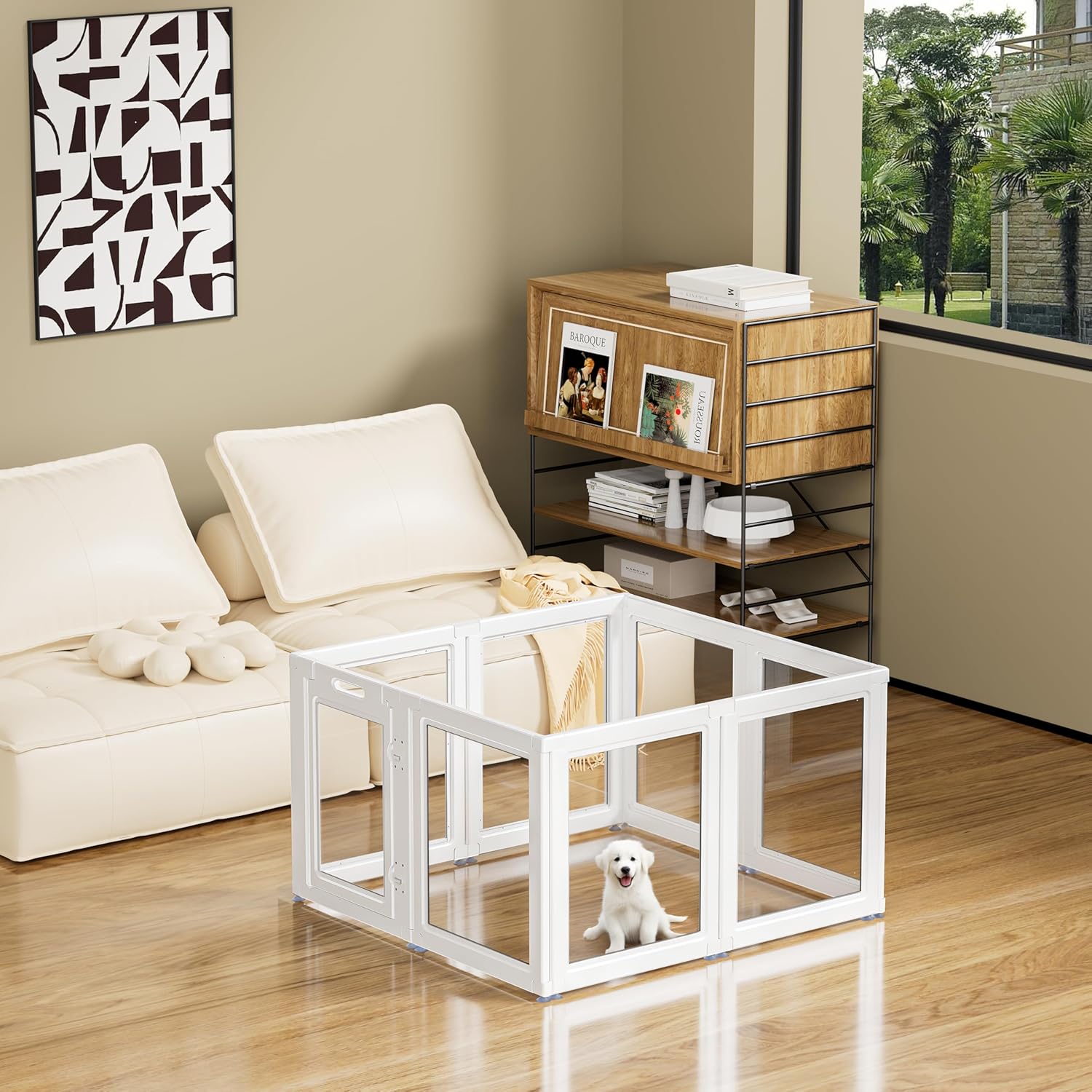 - 【NEWEST TRANSPARENT DOG PLAYPEN】SOLOWINNER clear puppy playpen broke the traditional cage fence design and adopted high-quality PE material and PET board, it's like a bright yard, more beautiful and atmospheric, easy clean, which makes your furry friend no longer anxious and feel like live in prison, never worry about your pet stucking in the fence, besides, it's convenient for you to observe your beloved pets.