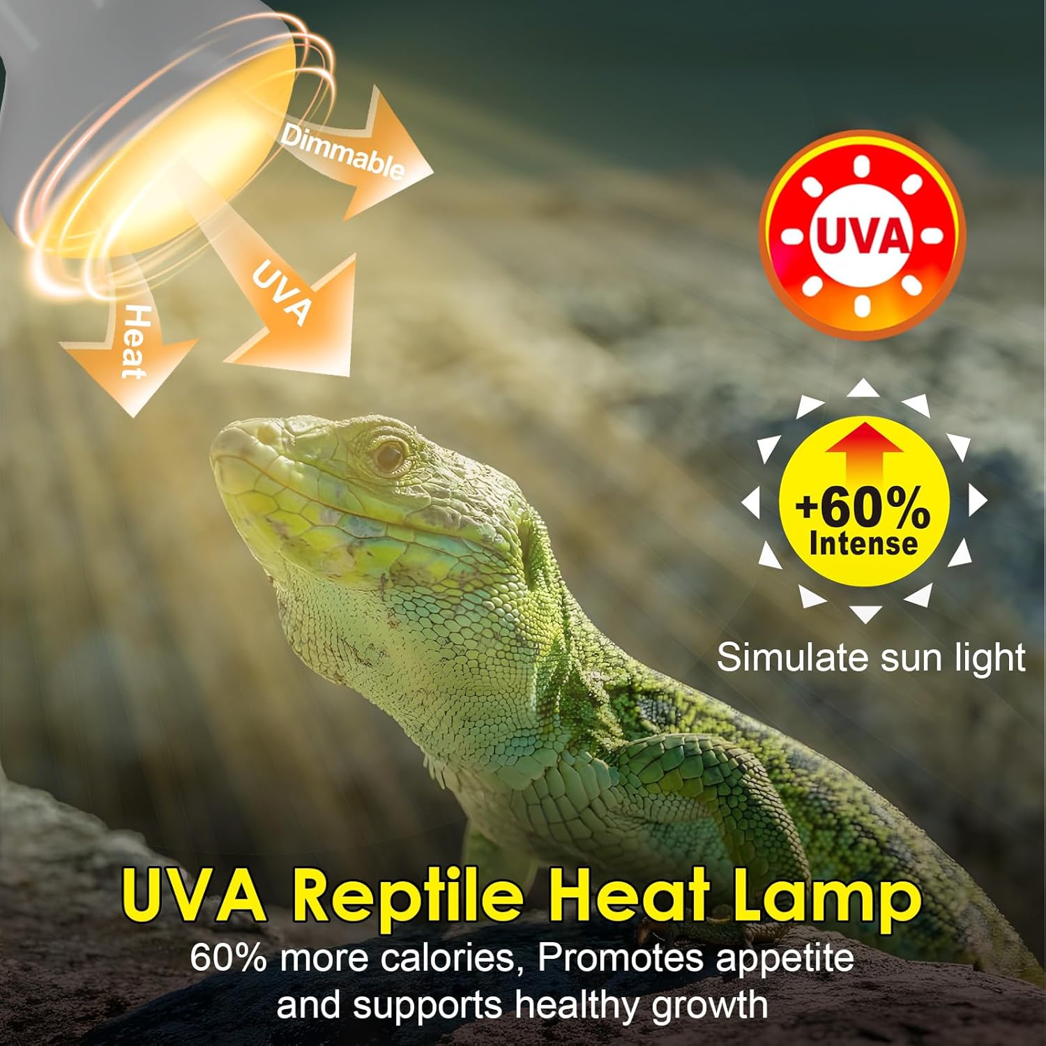 - UVA Sunlight Simulation for Healthy Behavior: Designed with UVA functionality to mimic natural sunlight, this reptile heat bulb encourages basking and supports your petβs circadian rhythm, promoting overall health and well-being. Perfect for reptiles like turtles, lizards, tortoises, bearded dragons, geckos, and even chickens.