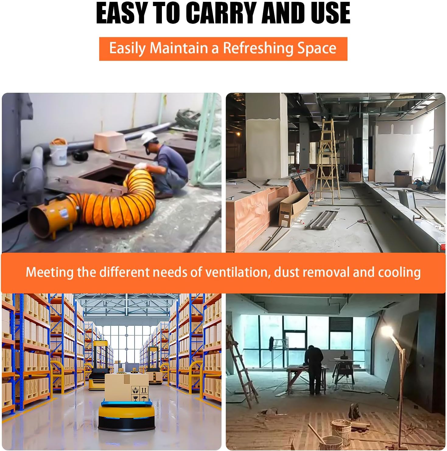 - Reliable Construction and Versatile Design: Built with a solid metal structure, this fan features a convenient carry handle for easy transport. Non-slip rubber feet minimize vibrations and ensure quiet operation. Perfect for a wide range of settings, including factories, basements, shipyards, farms, grain storage, warehouses, kitchens, offices, workshops, tunnels, automotive production, and other areas needing efficient ventilation.