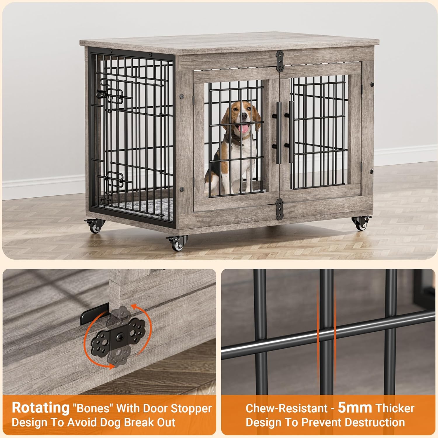 - [Reliable & Secure Design] Furniture dog crates are useful training tools for puppies. Dog crates for medium dogs feature 5mm fence, this piece of dog crate furniture is sturdier and more chew-resistant than wooden dog crates. Pet crate furniture uses rotating "Bones" With a door stopper design to increase firmness and avoid dog break out it.