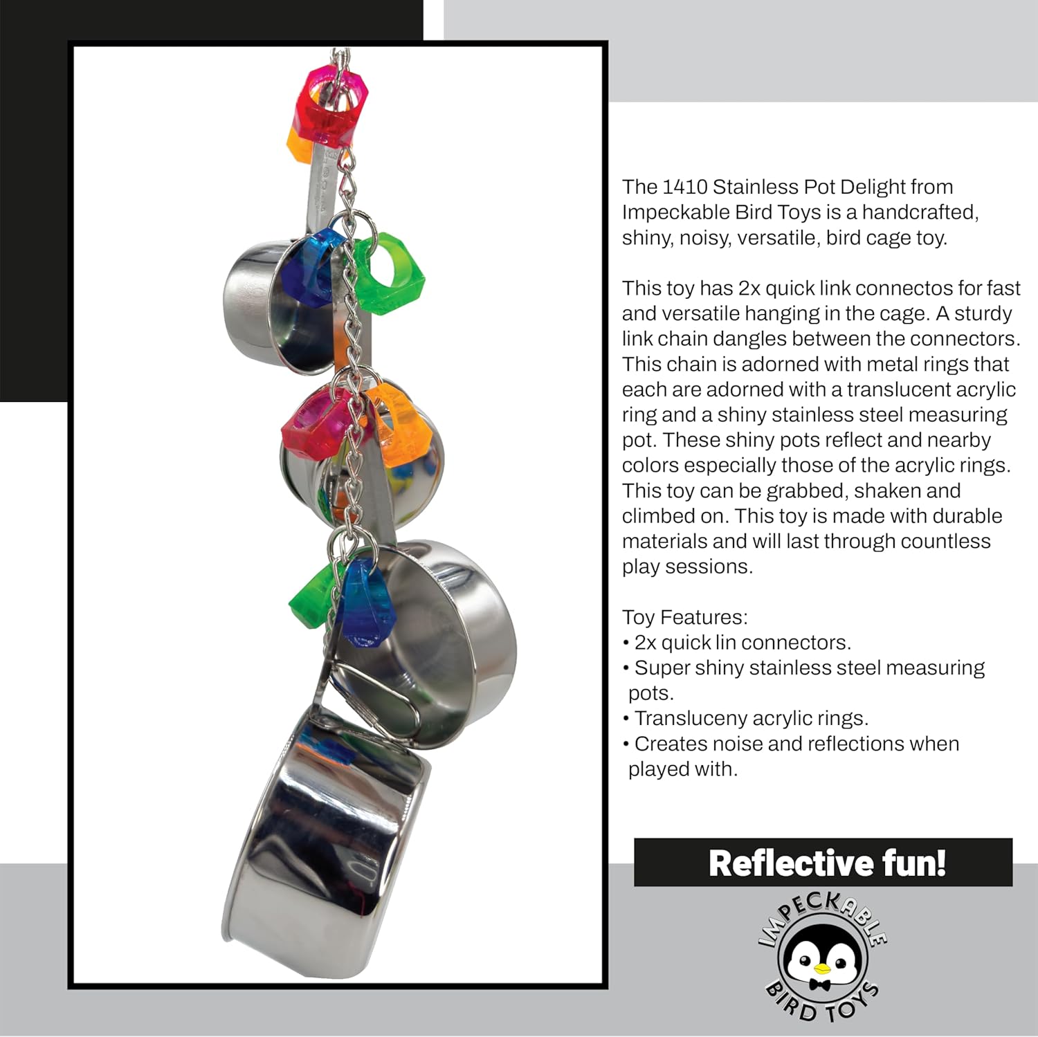 - HANDCRAFTED STAINLESS POT BIRD TOY The 1410 Stainless Pot Delight is handcrafted with a durable steel pot, shiny link chain, colorful acrylic charms, and lots of exciting textures for cage enrichment