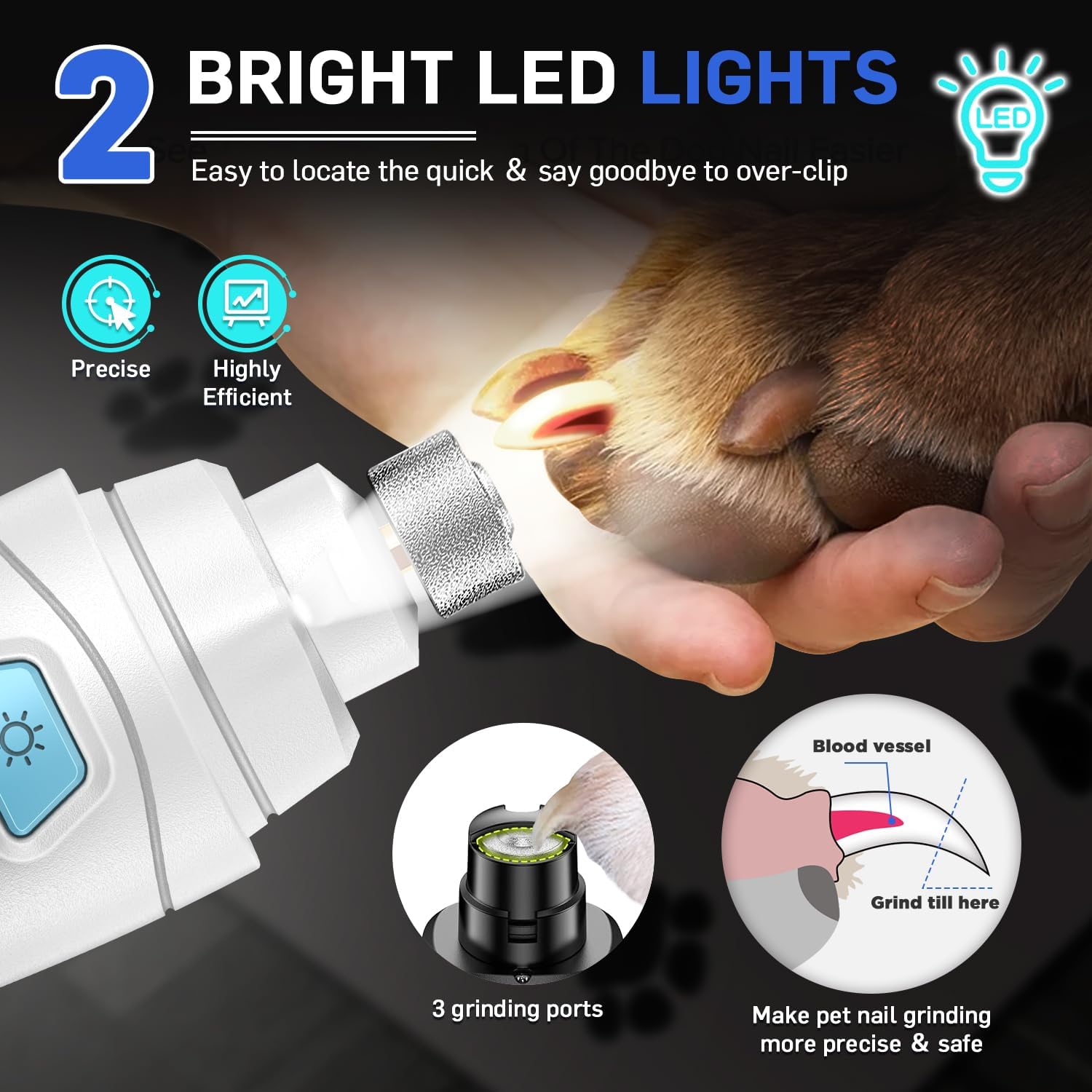 - 🎄🐾【2 Bright Lights & Long-Lasting Battery】Precision meets safety with the CADOLS lighted dog nail grinder. The electric dog nail file built-in 2 LED lights illuminate the nail bed, preventing over-clipping and ensuring a painless grooming session for your dog claws. Worry-free battery life is guaranteed with the 2000mAh high-capacity, rechargeable battery. Fully charged in just 4 hours, it offers an impressive 8 hours of operation,ensuring uninterrupted dog nail grooming sessions.