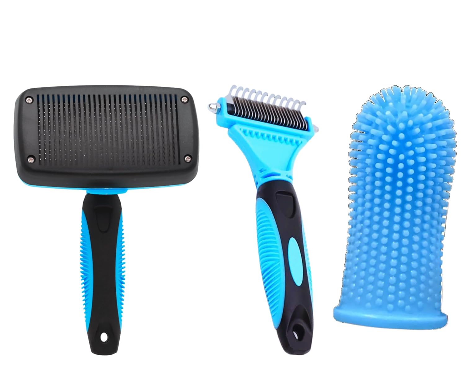 - COMPLETE 3-IN-1 PET GROOMING KIT: This all-in-one pet grooming kit includes a self-cleaning slicker brush for dogs, a durable undercoat rake for dogs, and a finger toothbrush for dental care. Itβs perfect for grooming, dematting, and maintaining hygiene for dogs, cats, and small pets at home.