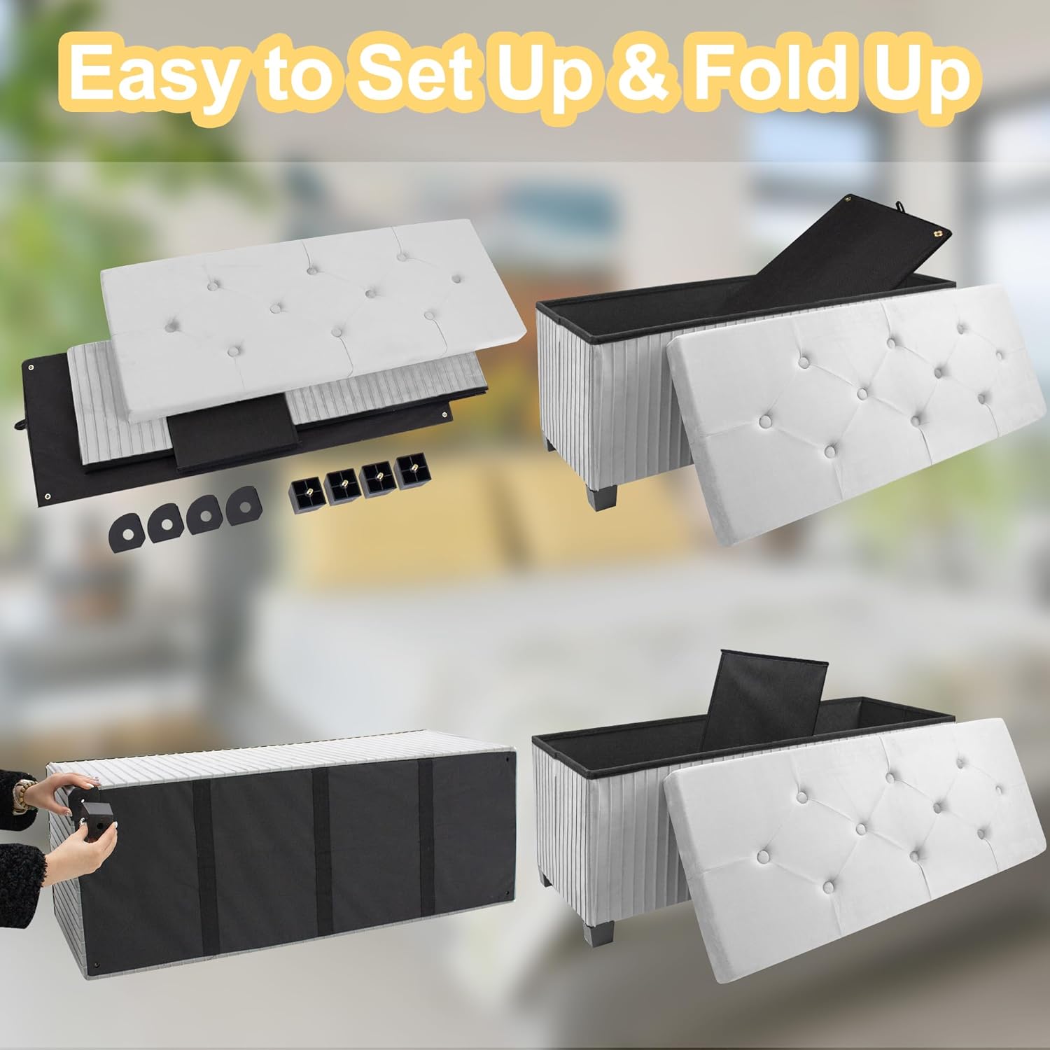 Storage Ottoman Bench, 43 Inch Foldable Ottoman with Legs, Velvet Foot Rest Stool, End of Bed Bench, Storage Chest for Living Room, Bedroom (Grey)