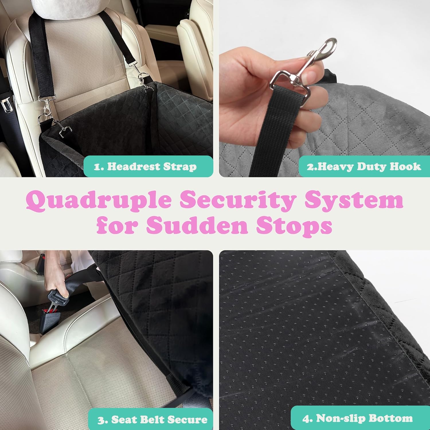 - π Secure Dog Car Seat for Safe Travel: No more sliding seats or sudden jolts that scare your pup; triple-point safety system with headrest strap, seatbelt pass-through, and safety tether keeps your fur baby secure during every turn and stop; perfect for anxious pets or first-time car riders