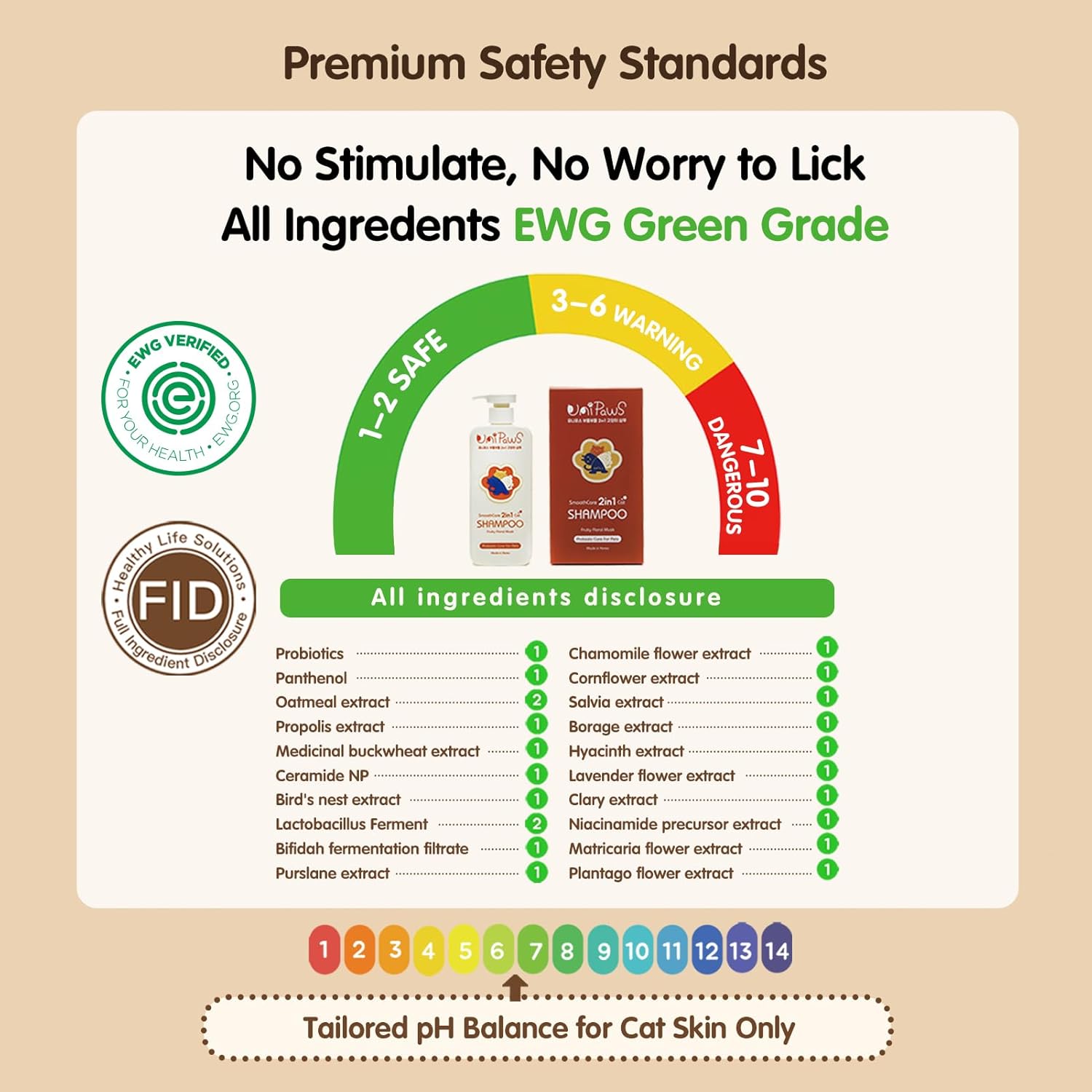 - Hypoallergenic & Tearless Formula for Sensitive Cats: Ideal for kittens, long-haired, short-haired cats, and even hairless Sphynx, this gentle, tearless shampoo and conditioner is perfect for sensitive skin. Made with natural ingredients like probiotics, oat, and propolis, it nourishes while leaving a fresh, shiny coat. Lick-safe and certified by the Korean Department of Animal Medicine, it provides peace of mind for responsible pet owners. Plus, itβs EWG Green Grade certified and comes with full ingredient disclosure (FID) for complete transparency.