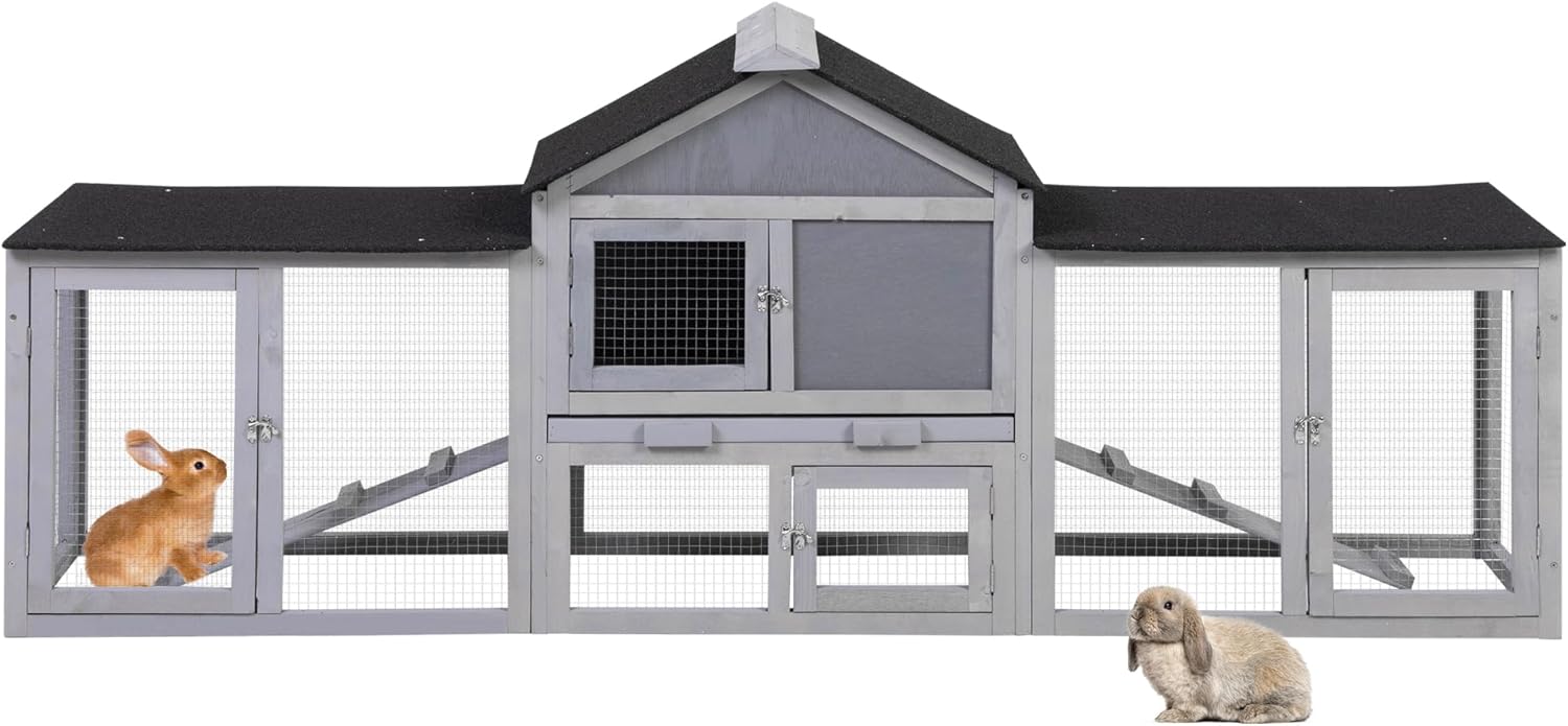82.5” Large Wooden Rabbit Hutch Outdoor Easy to Assemble Rabbit Cage and Durable Bunny Hutch Indoor with Cleaning Tray & Waterproof Roof for Small and Medium Bunny Rabbit Chick (Grey)