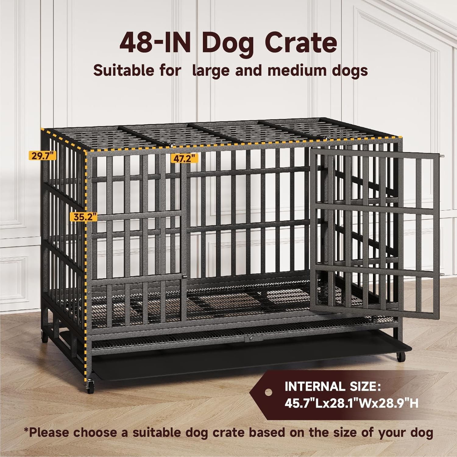 - Durable Dog Crate:The 48" upgraded dog cage is indestructible.It is made of corrosion-resistant and reinforced 0.79 inch diameter steel tubes.Multi-layered protective non-toxic coating keeps your dog healthy,suitable for most medium and large dogs