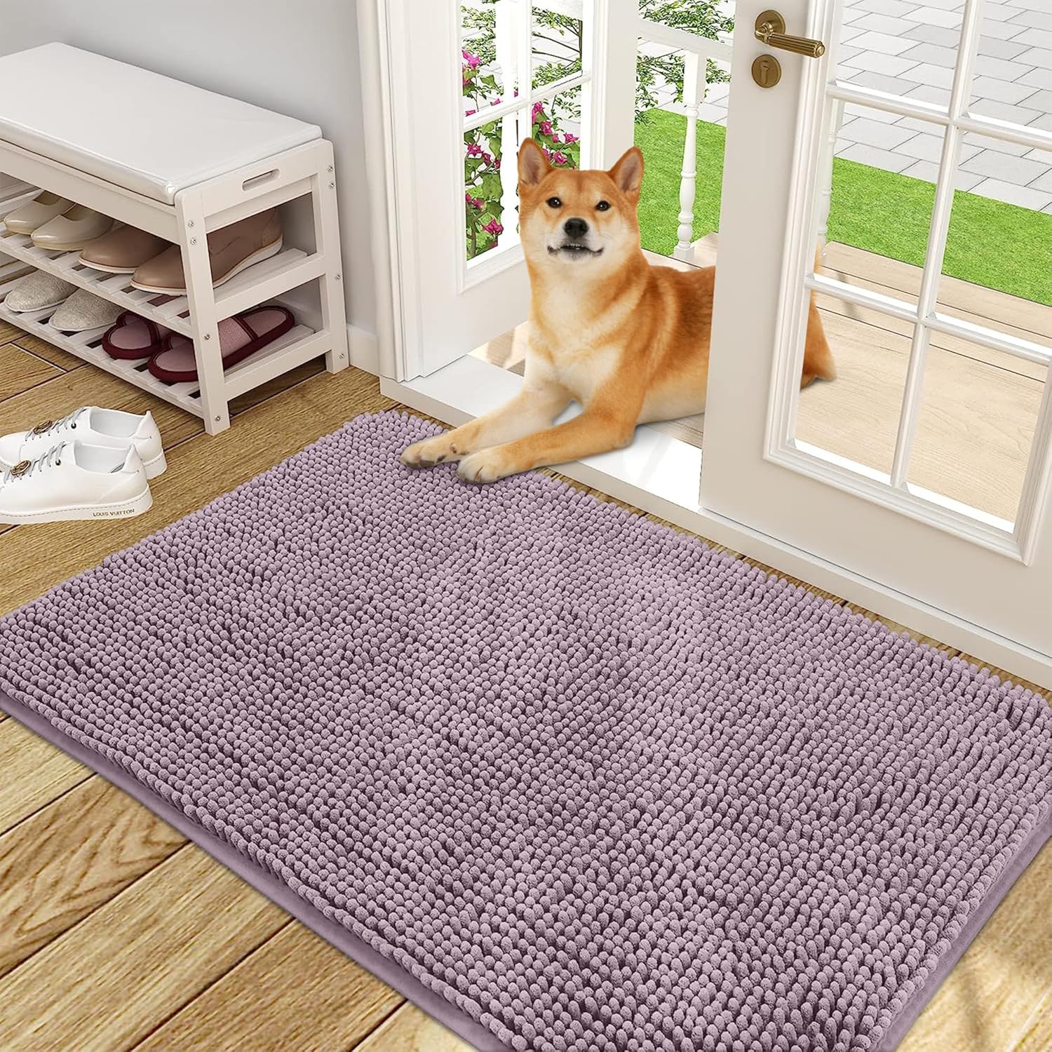 - [LOW PROFILE AND EASY CARE] OLANLY's Chenille Dog Door Mat boasts a slim 1-inch profile, offering a sleek and streamlined appearance. The thoughtful design ensures your doors won't get stuck, and the mat stays securely in place. Cleaning is a breeze – simply shake off any dirt or debris, or toss it in the washing machine for a deeper clean. It dries quickly, so you can be sure it's ready to use again in no time.