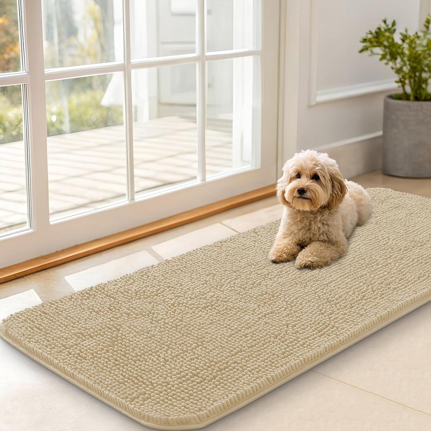 OLANLY Dog Door Mat for Muddy Paws 47x20, Absorbs Moisture and Dirt, Absorbent Non-Slip Washable Doormat, Quick Dry Chenille Mud Mat for Dogs, Entry Indoor Entryway Carpet for Inside Floor, Beige