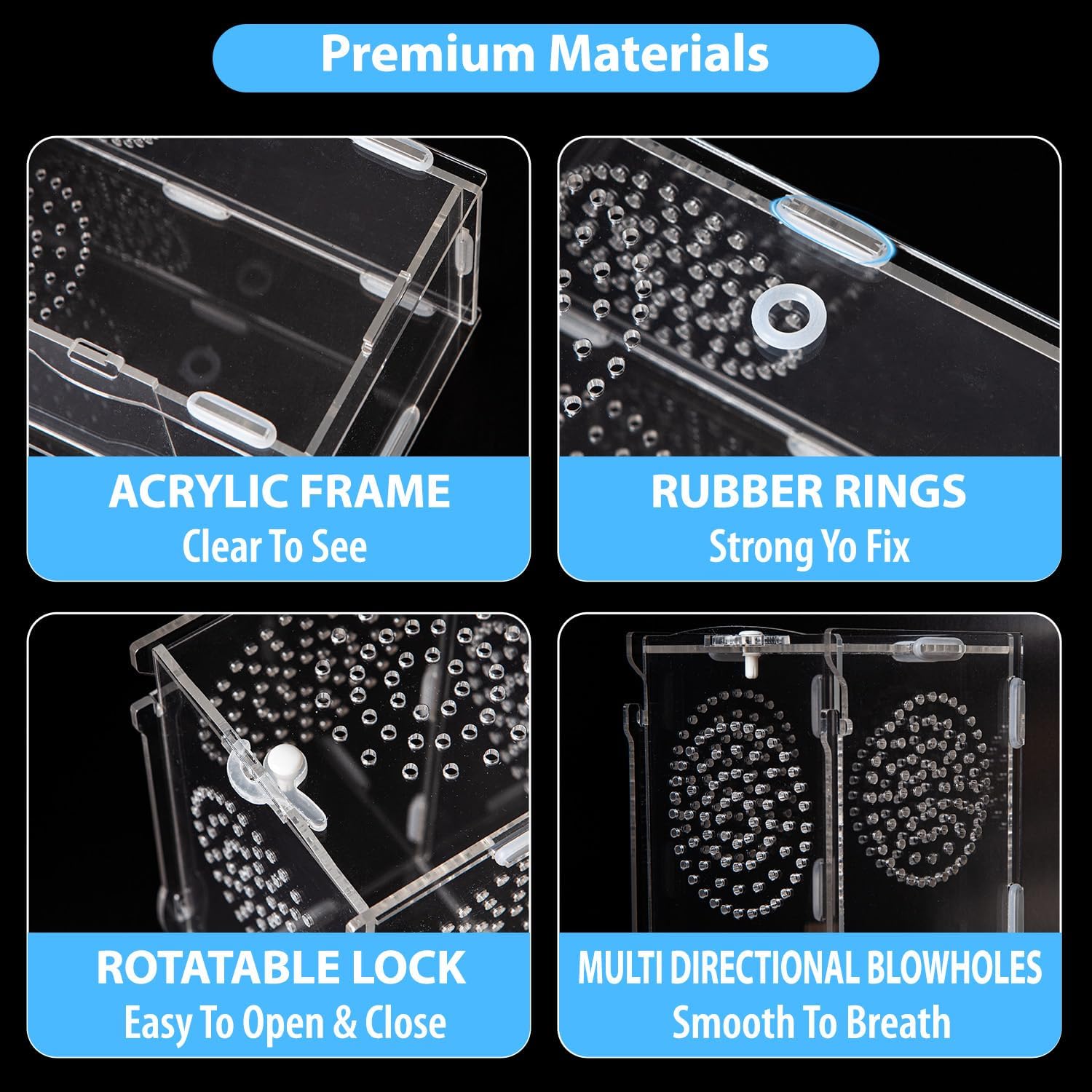 - γ Premium Material and SafeγThis reptile enclosure is crafted from high-quality acrylic plastic, reliable and sturdy to service for long time. High elasticity rubber rings can seal the whole cage well, and the double insurance of rotatable jailbreak lock on the top prevent pets from escaping