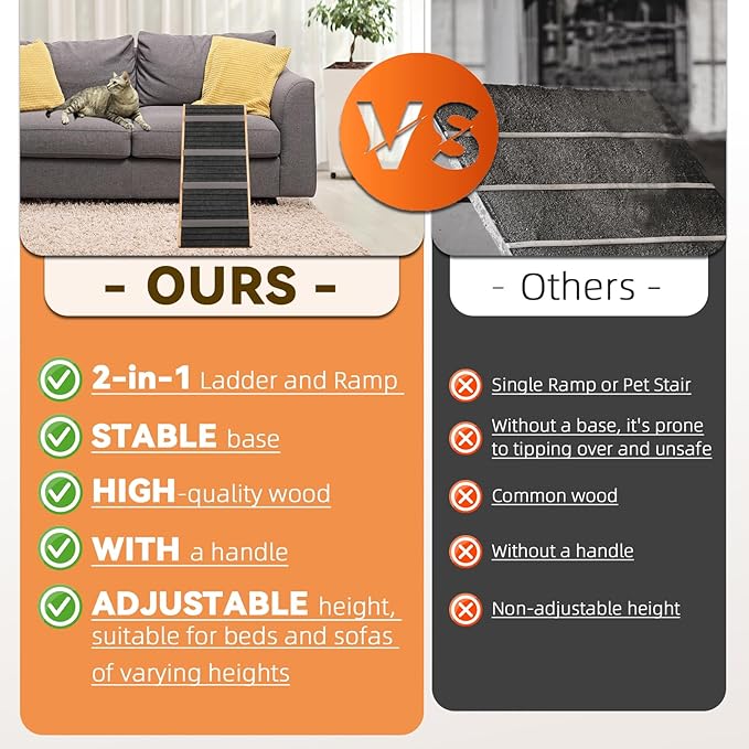 - Versatile Convertible Design: This 2-in-1 pet stair and ramp allows for easy switching between a 4-step pet stair and a ramp, offering flexible access for older, arthritic, or small pets to reach sofas, beds, and cars. It's perfect for all dogs and cats with mobility challenges.