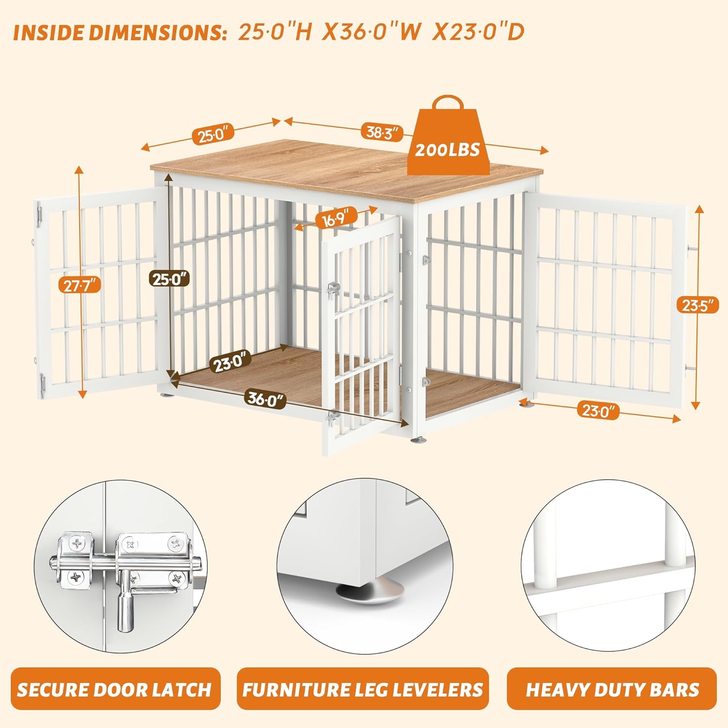- 【Assemble with Ease】Inside Dimensions: 36.0'L X23.0"W X25.0"H, Overall Dimensions: 38.3"L x 25"W x 27.7"H. Choosing the right crate size is vital to ensure your dog’s safety and comfort.