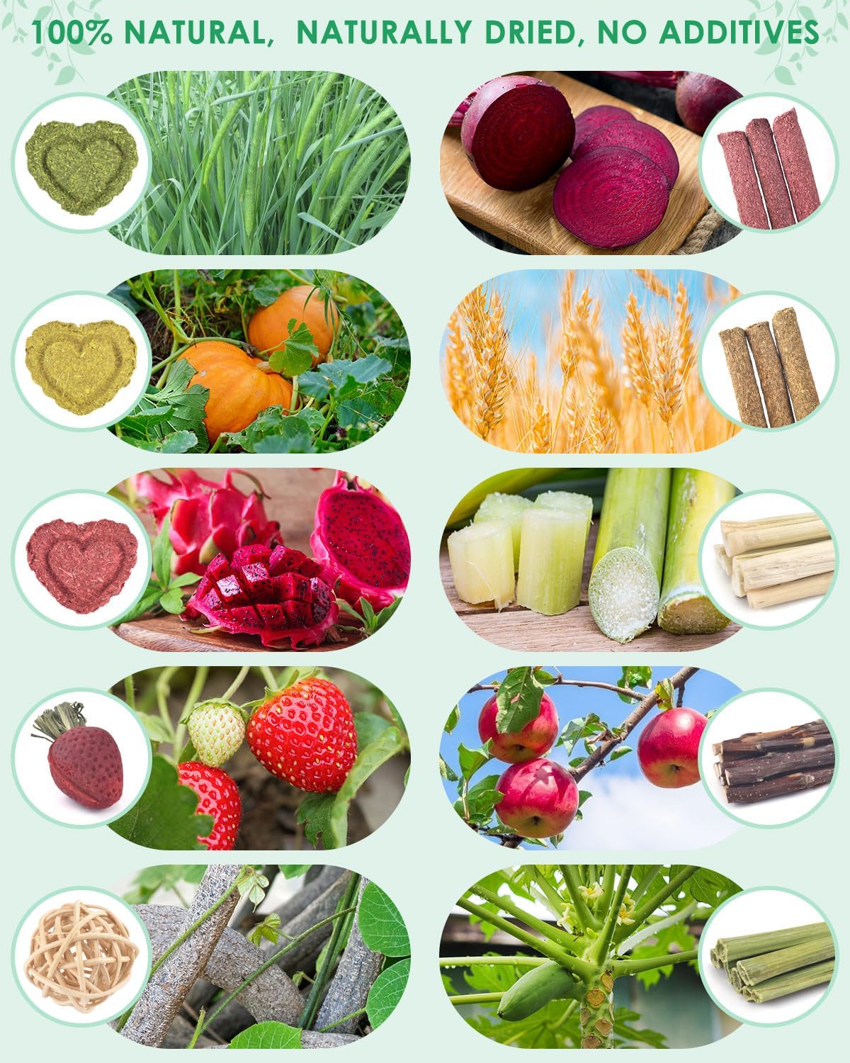 - 53 PIECES OF GUINEA PIG CHEW TOYS: 5 each of Timothy/Wheat/Beet+10 Applewood+6 Sweet Bamboo+6 Papaya Stems+6 Strawberries * 2+Mushrooms * 2+Heart shaped Grass Cake Timothy/Pumpkin/Dragon Fruit * 2 each+3 Original Vine Balls/Star Cake * 3 each