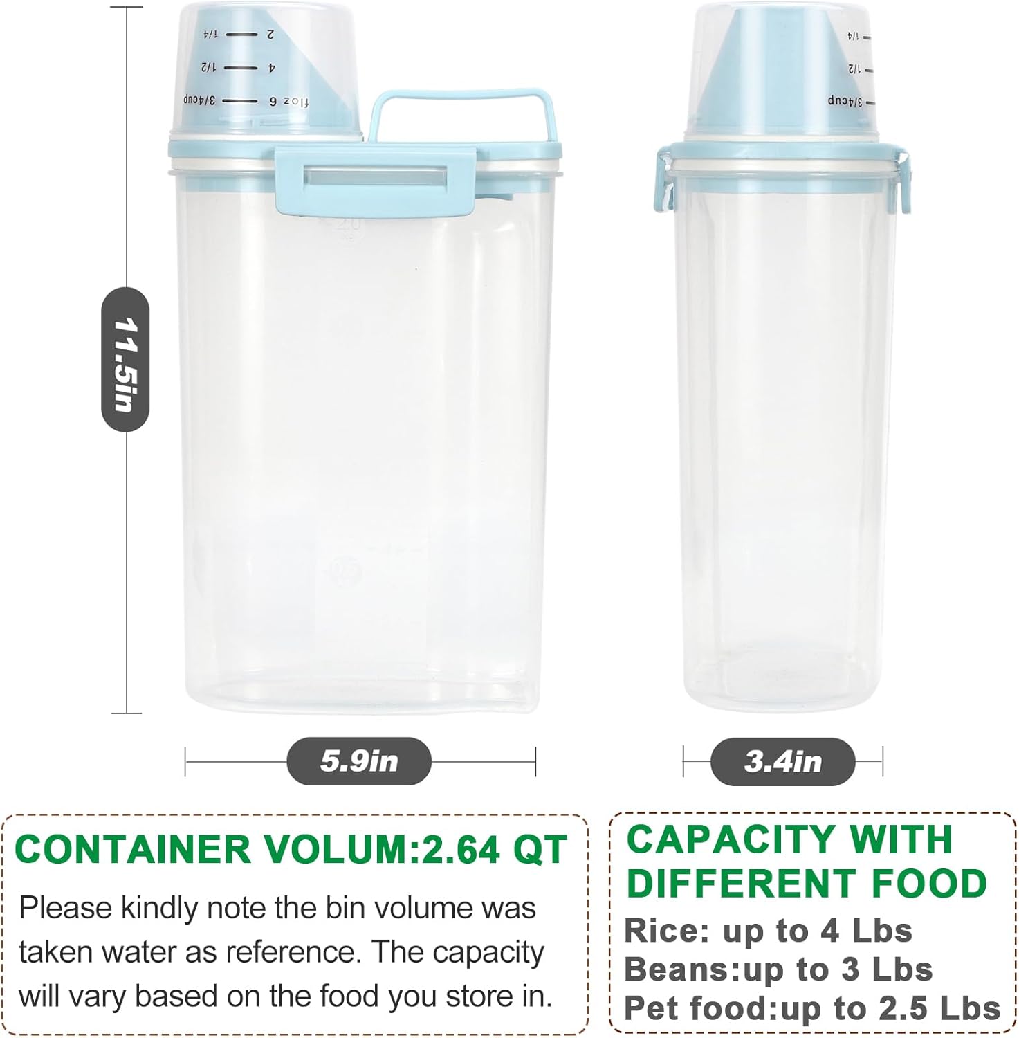 - AIR-TIGHT CEREAL CONTAINER: With the snap-lock latches and silicone gaskets, the dry food storage container can shut tightly to ensure pet food stay super fresh, capped with a secure cup for easy measuring and access to your stored food