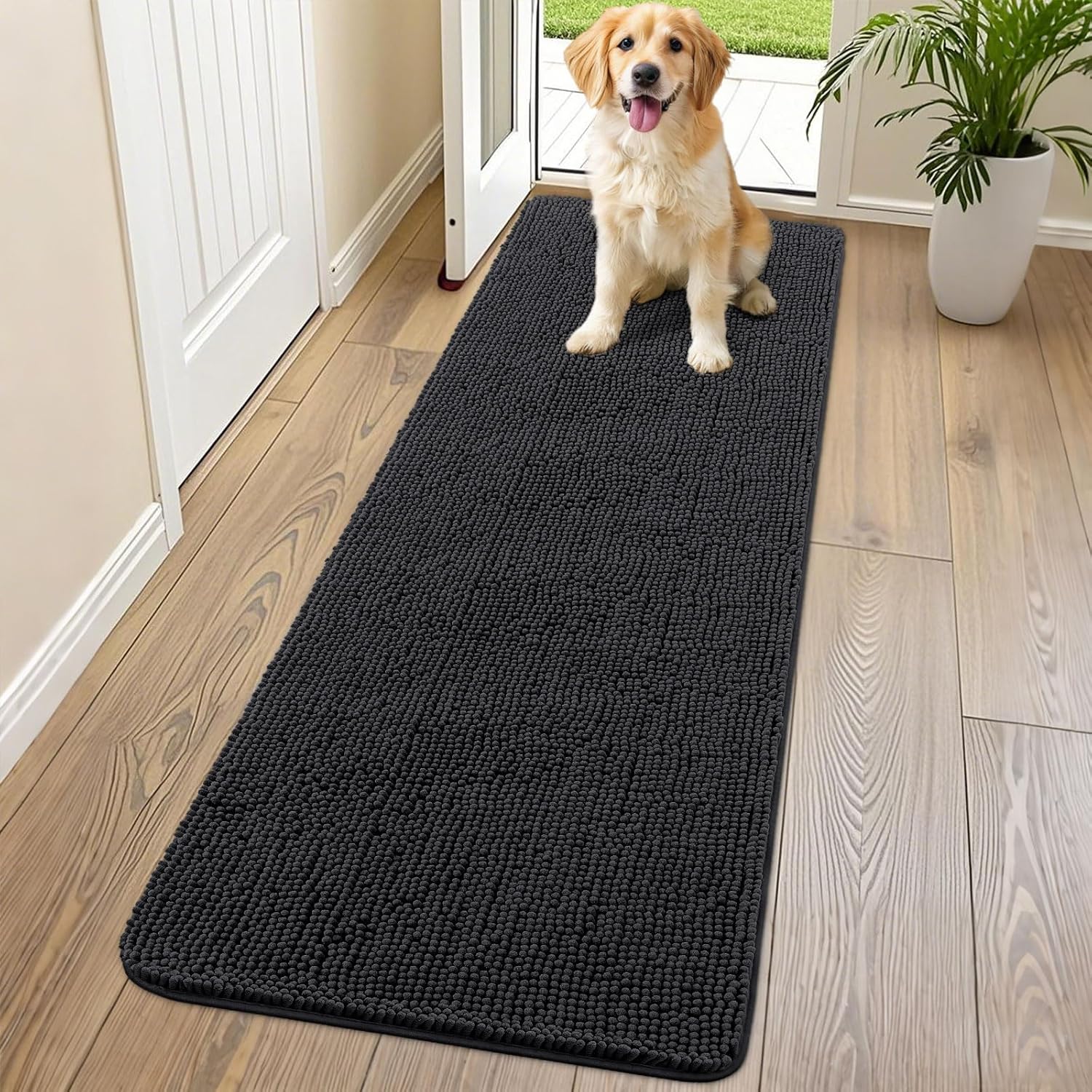 Smiry Dog Door Mat for Muddy Paws 70x24, Absorbs Moisture and Dirt Doormat, Non-Slip Washable Quick Dry Chenille Front Door Mat Indoor Entrance, Entryway Carpet for Inside Floor, Black