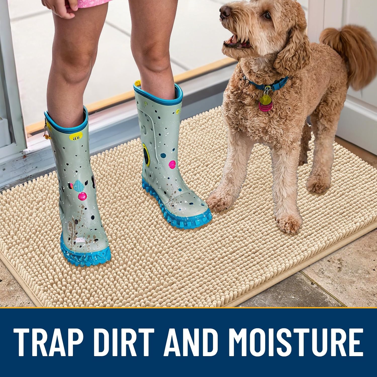 - [Absorbent and Dirt Trapper] High-density chenille dog mat, super absorbent and dirt-catching, whether wet after shower, muddy or moisture bring back by dogs, it can absorb well, so that you and your favorite pet can say goodbye to the wet and mud. It's an excellent choice for use as an entryway door mat, a welcome door mat or a dirt-trapping door mat.
