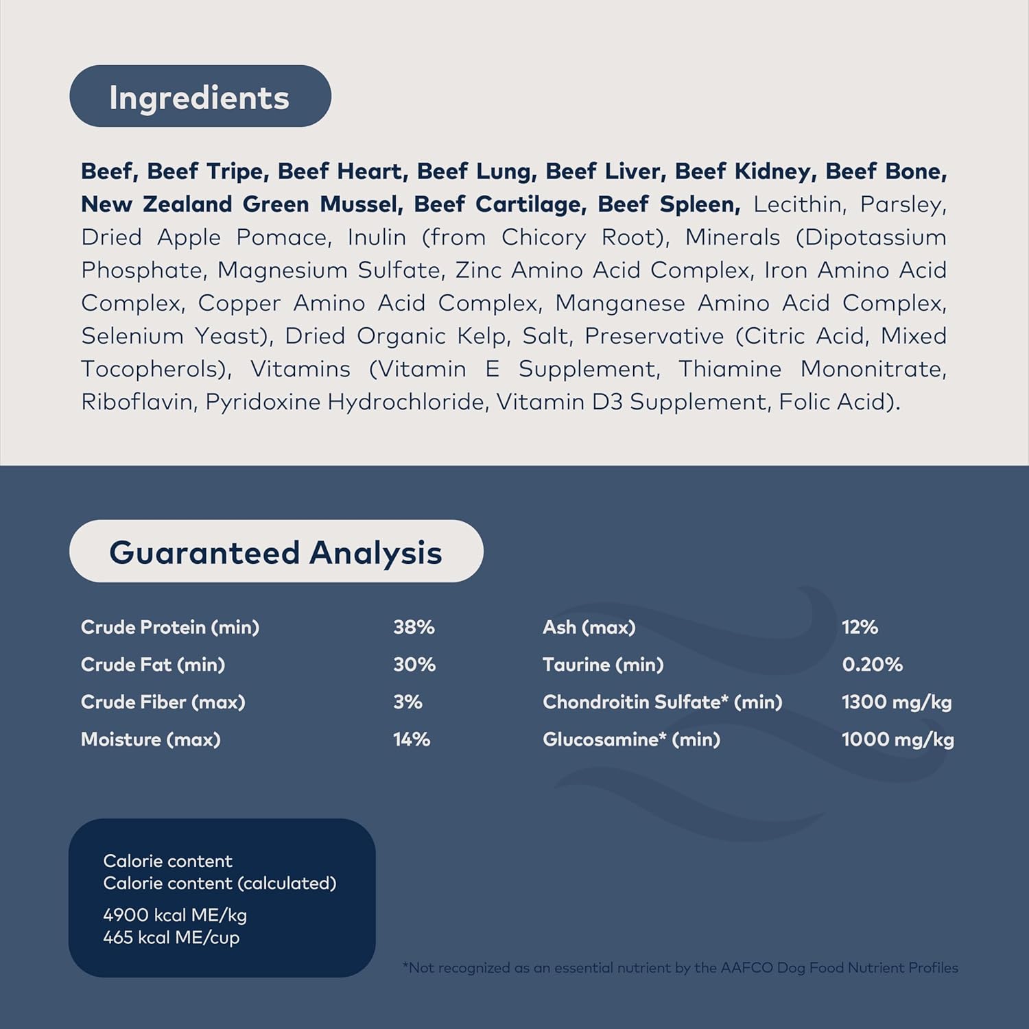- HIGH PROTEIN, NUTRIENT DENSE: Featuring free-range Beef, Organs, Bone, and New Zealand Green Mussels, this grain-free dog food delivers nutrition with a mouth-watering taste for all dogs. Gentle air dried processing retains the goodness of the raw ingredients. This food offers stimulating crunchy texture small enough for puppy food but soft enough for senior dog food.