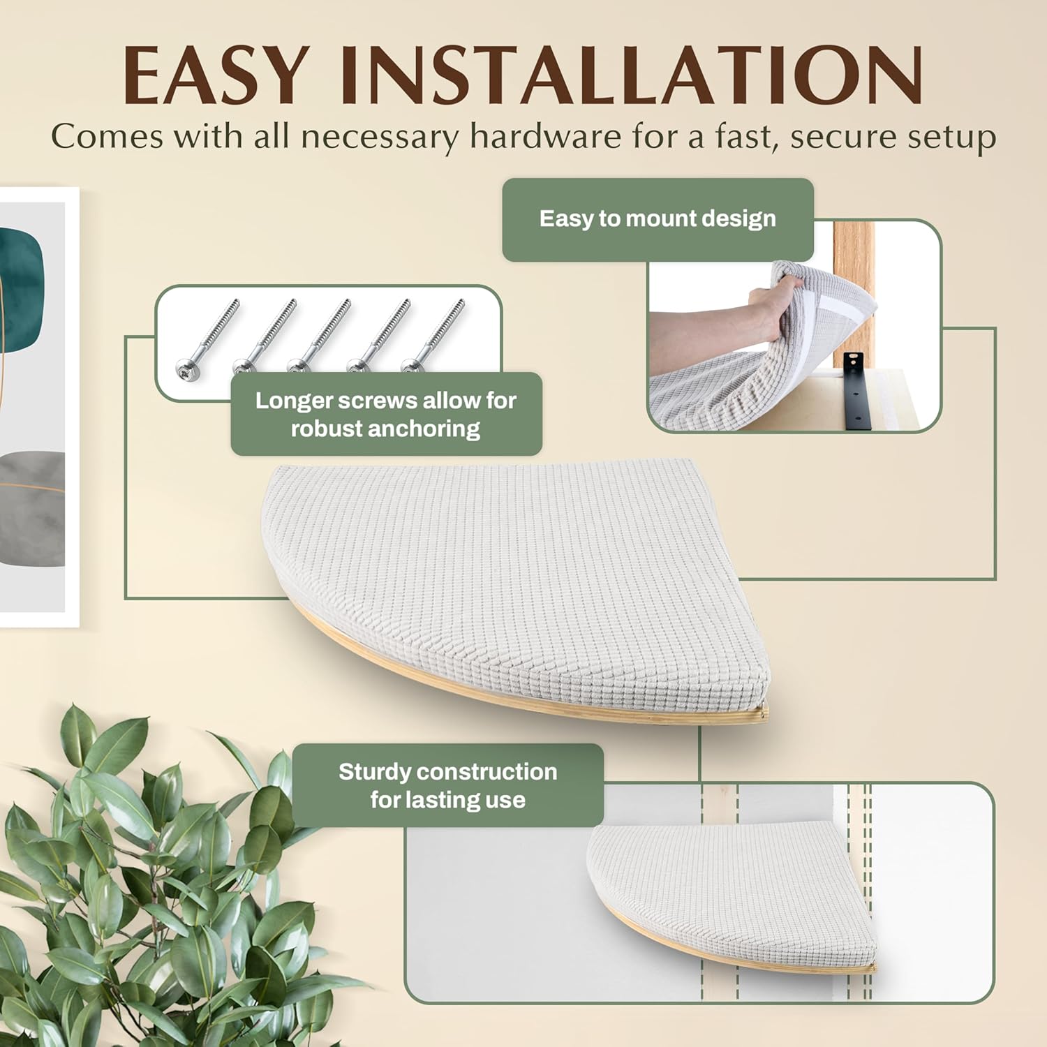 - LARGEST CORNER WALL SHELF - This wall-mounted cat shelf features a fan-shaped semi-circle with a spacious 9.84” radius × 2” thickness, this is the largest fan-shaped cat shelf available! Designed to comfortably fit two cats, it provides ample room for lounging, stretching, and climbing. It maximizes unused wall space, creating a floating cat shelf that serves as an elevated cat perch wall, keeping your floors clutter-free.