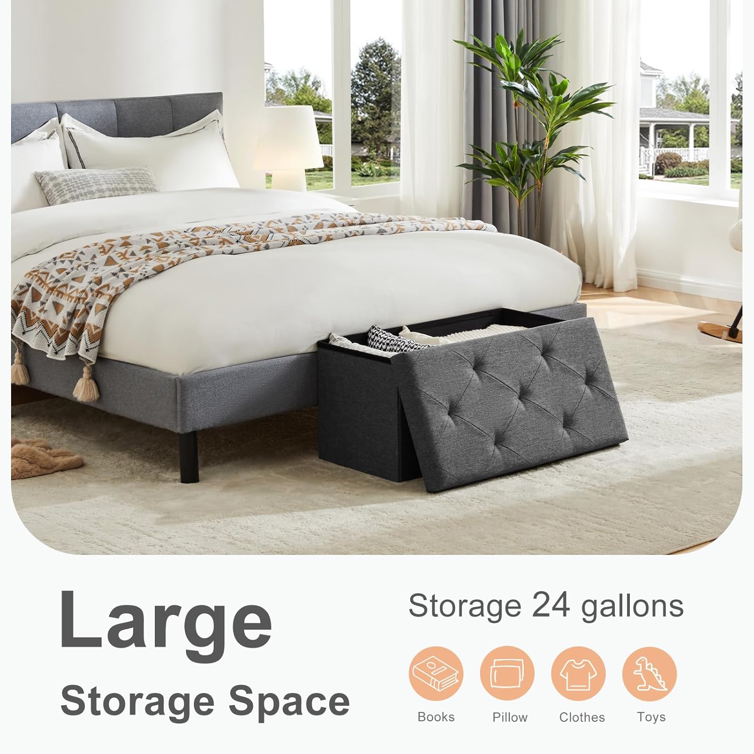 - γLarge Storage SpaceγThe design of the storage ottoman bench provides ample storage space, allowing for the organization of various daily necessities such as magazines, books. This facilitates effective space management and promotes a more orderly lifestyle.