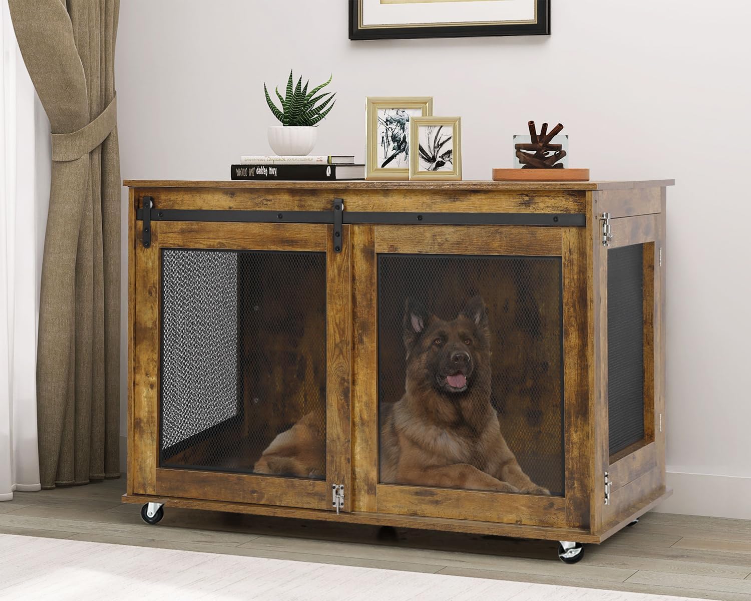 - 【Modern Dog Kennel】Modern Grey Dog crate furniture with sliding barn doors, suitable for any home decoration style. 5 wheels at the bottom, 2 can be fixed and can be moved anywhere you want