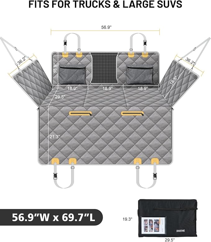 - Extended Activity Space: Our car hammock (56.9”W x 29.5”D) prevents footwell sliding, expands space by 40%, and ensures safety for movement and stretching to ease travel anxiety. Offers full rear-seat coverage, ideal for large breeds, older dogs, or multi-dog households.