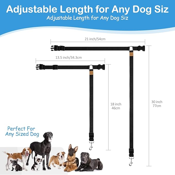 - 【Adjustable for All Pet Sizes】Our vehicle seatbelts harness offers adjustable lengths between 18 to 30 inches, making it easy to fit pets of all sizes, from small cats to large dogs. You can easily modify the leash length for your pet's comfort and safety. The adjustable dog cat safety seat belt strap ensures that your furry friend remains secure, while still having the freedom to move comfortably in the backseat.