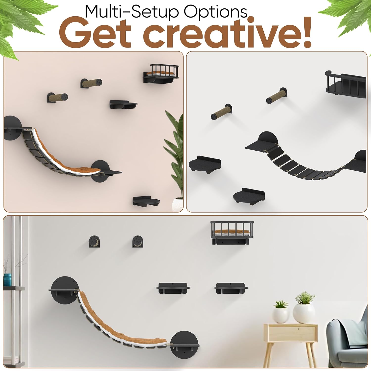 - THE COMPLETE CAT WALL SHELVES SET – EVERYTHING YOUR CAT NEEDS – Our 7-piece cat wall furniture set includes all the essentials: 2 sisal steps, 2 cat wall steps, 1 cushioned bed, 1 cushioned bridge/ladder, and 1 carpet scratch mat. Plus, all the necessary hardware and a step-by-step guide are included to make creating your cat's climbing paradise quick and easy!